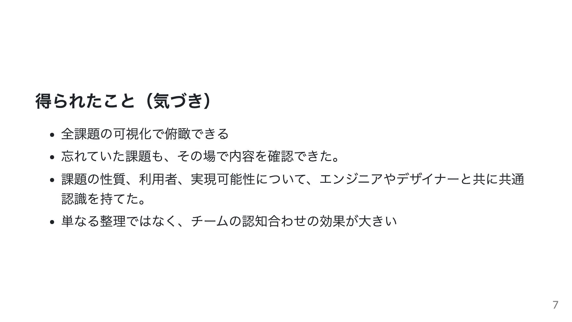 得られたこと(気づき) 全課題の可視化で俯瞰できる 忘れていた課題も、その場で内容を確認できた。 課題の性質、利用者、実現可能性について、エンジニアやデザイナーと共に共通 認識を持てた。 単なる整理ではなく、チームの認知合わせの効果が大きい 7