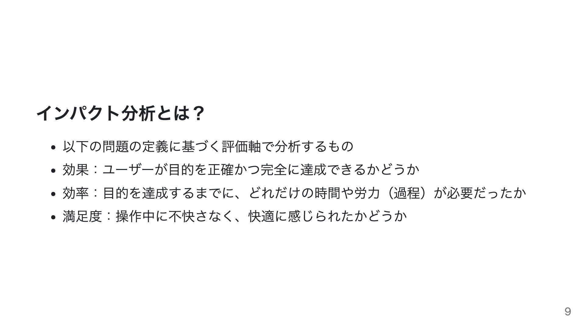 インパクト分析とは? 以下の問題の定義に基づく評価軸で分析するもの 効果:ユーザーが目的を正確かつ完全に達成できるかどうか 効率:目的を達成するまでに、どれだけの時間や労力(過程)が必要だったか 満足度:操作中に不快さなく、快適に感じられたかどうか 9