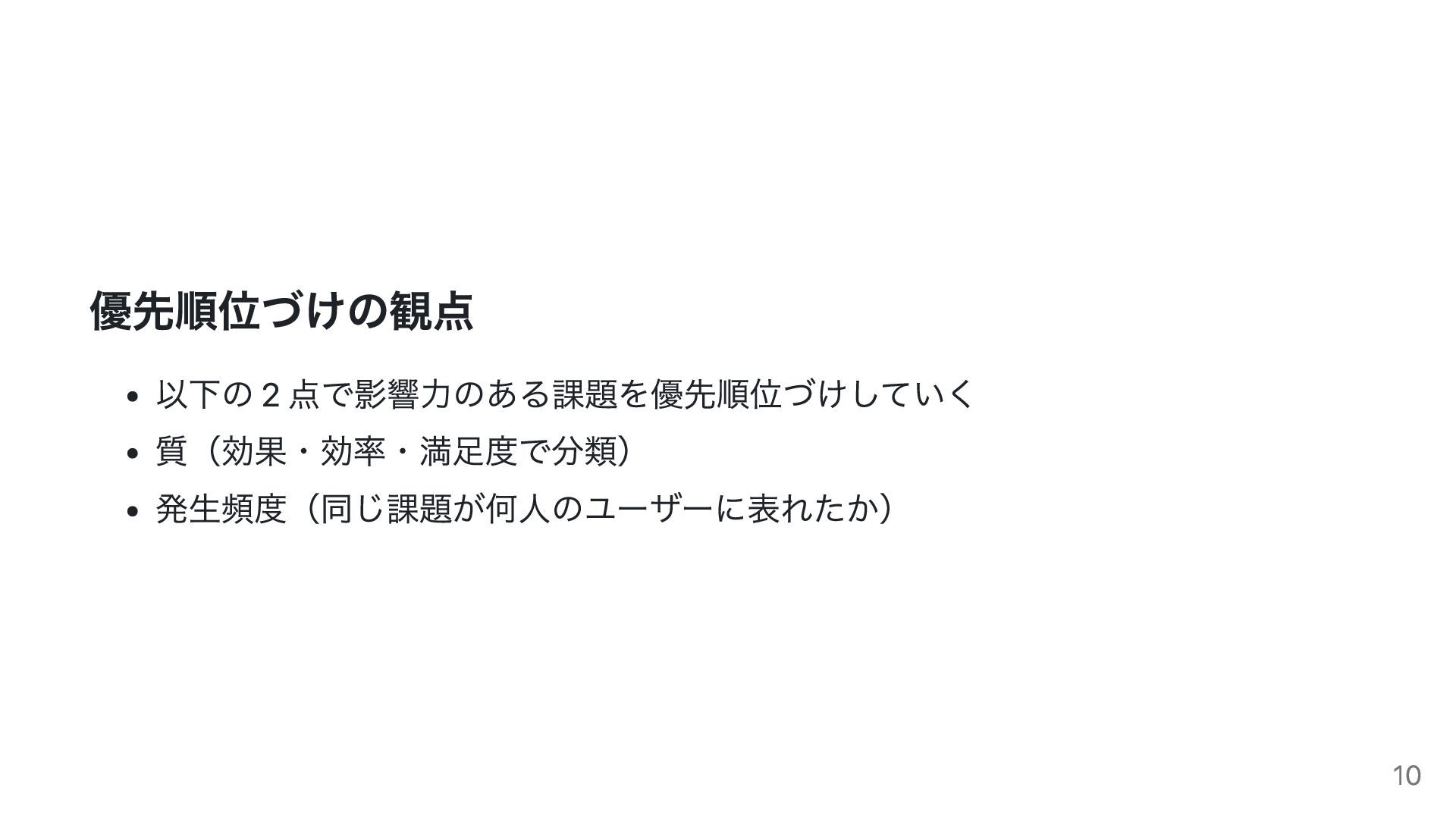 優先順位づけの観点 以下の 2 点で影響力のある課題を優先順位づけしていく 質(効果・効率・満足度で分類) 発生頻度(同じ課題が何人のユーザーに表れたか) 10