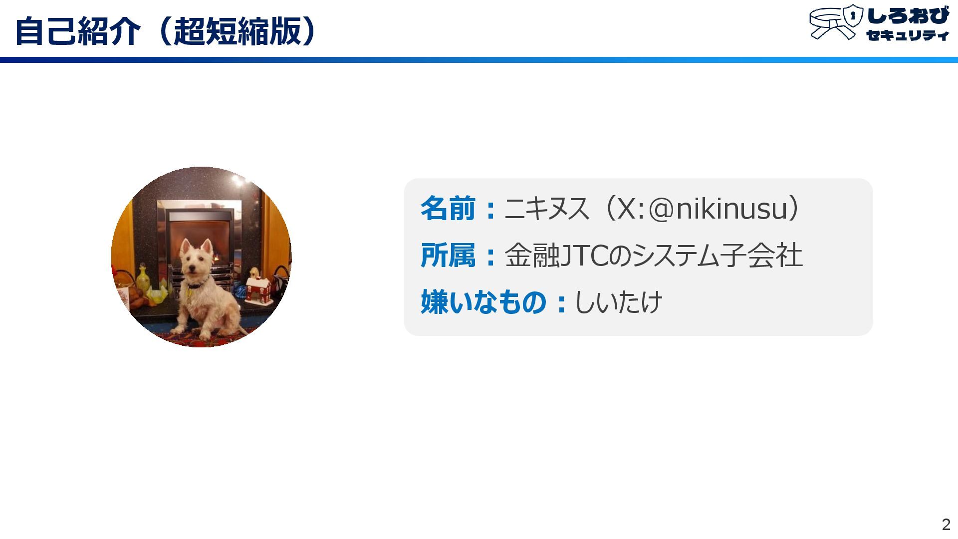 自己紹介(超短縮版) 2 名前:ニキヌス(X:@nikinusu) 所属:金融JTCのシステム子会社 嫌いなもの:しいたけ
