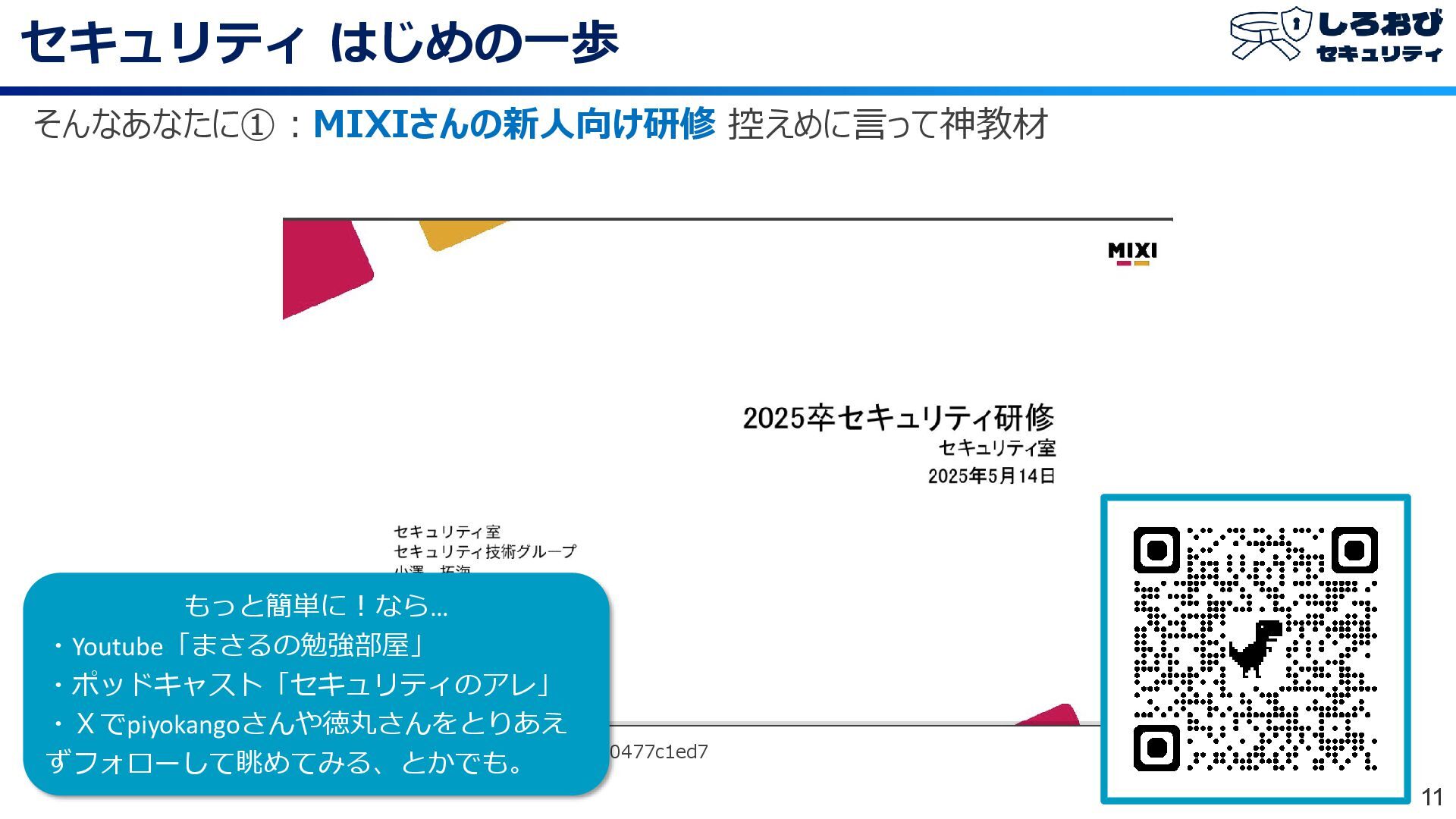 セキュリティ はじめの一歩 11 そんなあなたに①:MIXIさんの新人向け研修 控えめに言って神教材 https://zenn.dev/mixi/articles/95e0d0477c1ed7 もっと簡単に!なら… ・Youtube「まさるの勉強部屋」 ・ポッドキャスト「セキュリティのアレ」 ・Xでpiyokangoさんや徳丸さんをとりあえ
