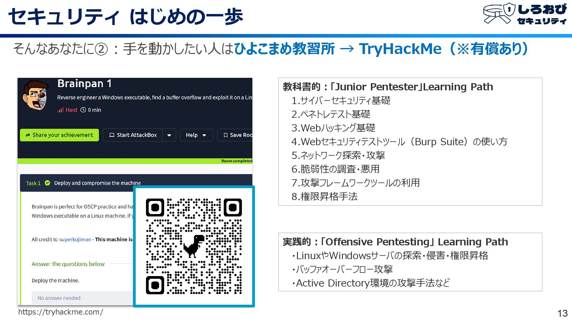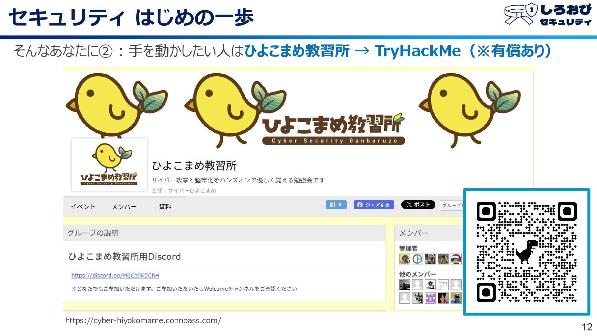 セキュリティ はじめの一歩 12 そんなあなたに②:手を動かしたい人はひよこまめ教習所 → TryHackMe(※有償あり) https://cyber-hiyokomame.connpass.com/