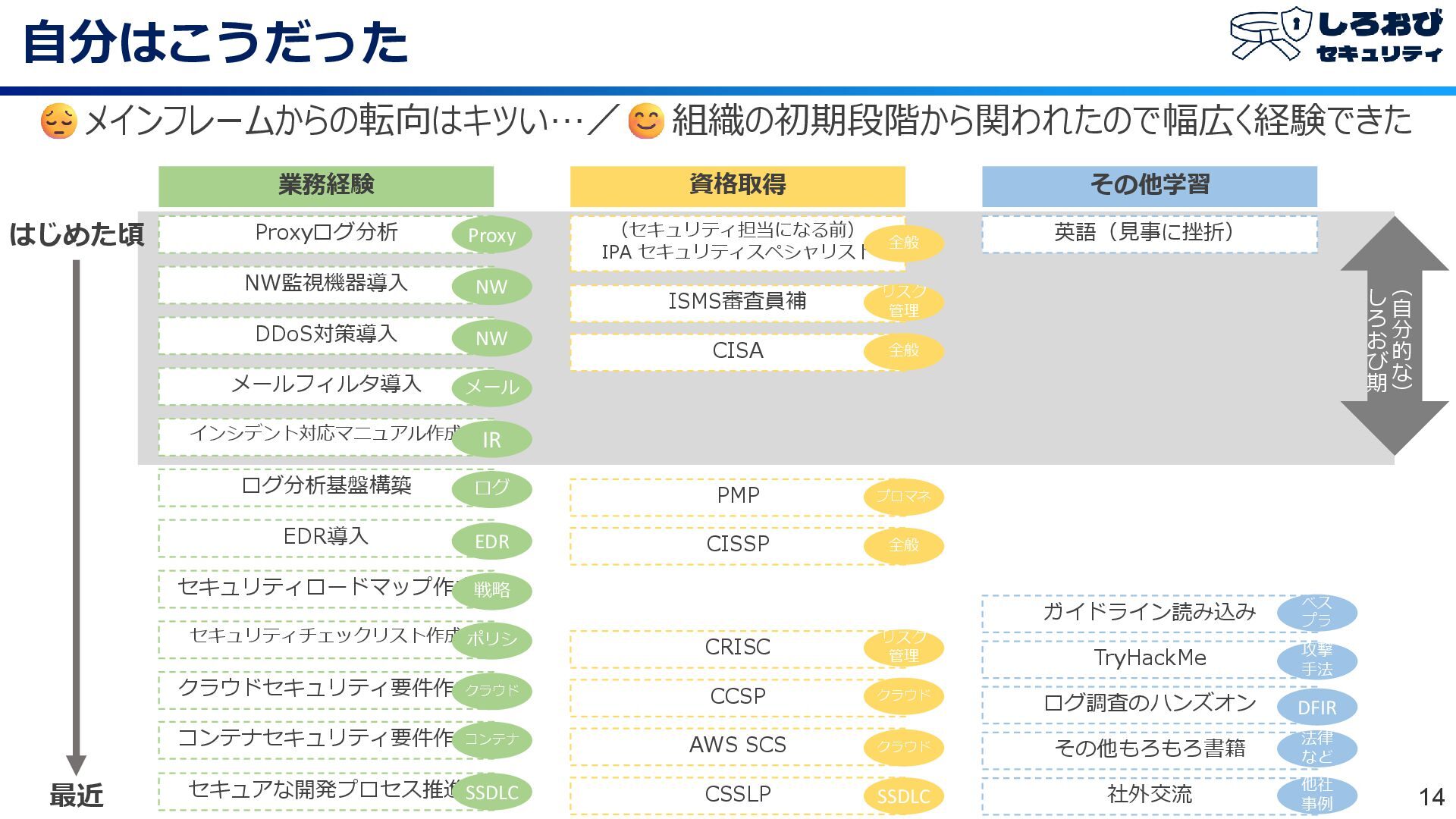 自分はこうだった 14 メインフレームからの転向はキツい…/ 組織の初期段階から関われたので幅広く経験できた 業務経験 Proxyログ分析 NW監視機器導入 メールフィルタ導入 インシデント対応マニュアル作成 ログ分析基盤構築