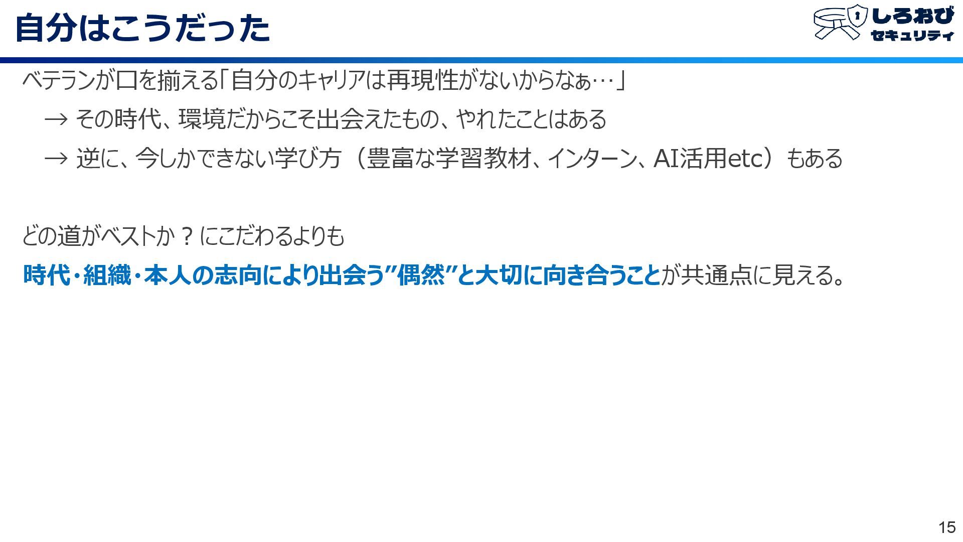 自分はこうだった 15 ベテランが口を揃える「自分のキャリアは再現性がないからなぁ…」 → その時代、環境だからこそ出会えたもの、やれたことはある → 逆に、今しかできない学び方(豊富な学習教材、インターン、AI活用etc)もある どの道がベストか?にこだわるよりも 時代・組織・本人の志向により出会う”偶然”と大切に向き合うことが共通点に見える。