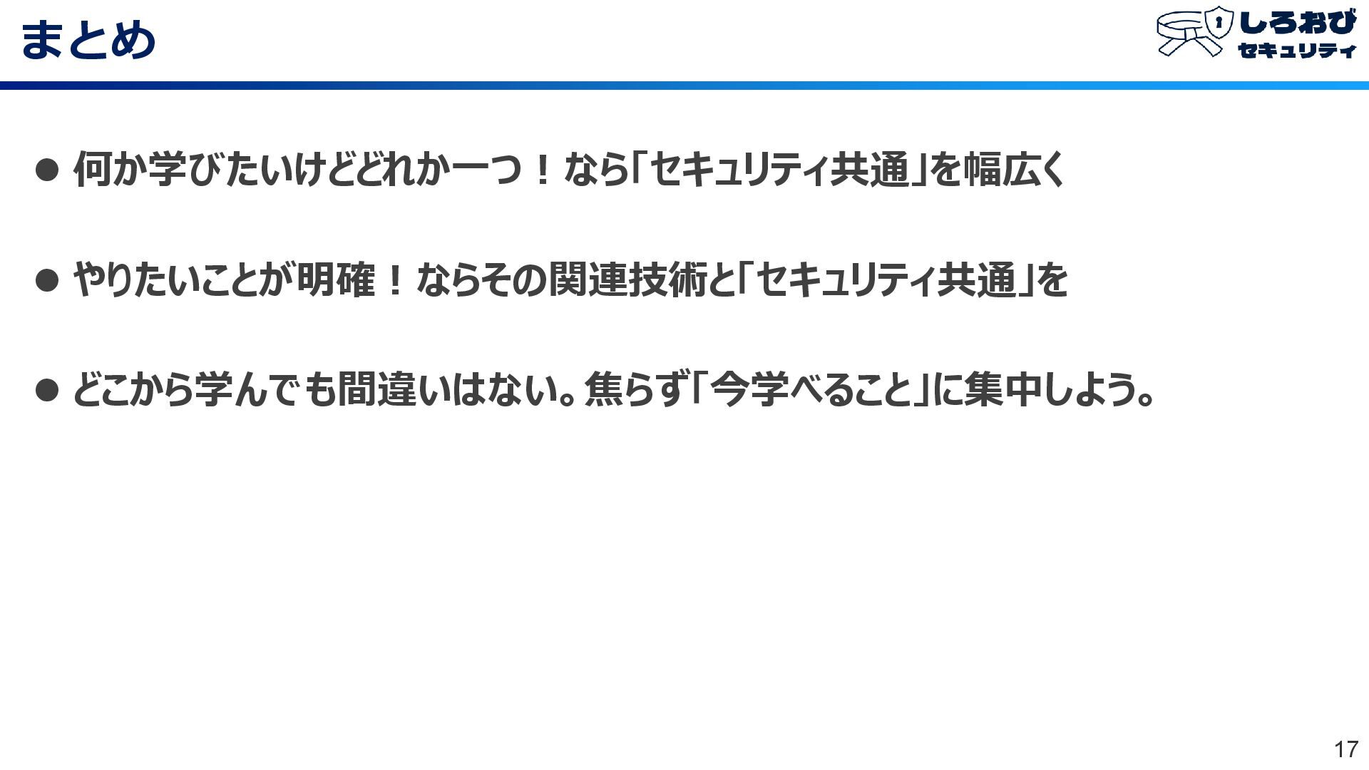 まとめ 17 ⚫ 何か学びたいけどどれか一つ!なら「セキュリティ共通」を幅広く ⚫ やりたいことが明確!ならその関連技術と「セキュリティ共通」を ⚫ どこから学んでも間違いはない。焦らず「今学べること」に集中しよう。