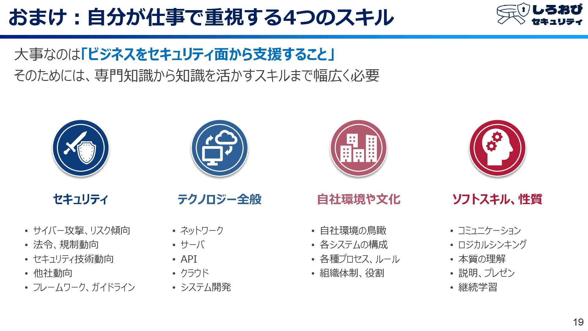 • 説明、プレゼン • 継続学習 ソフトスキル、性質 • 自社環境の鳥瞰 • 各システムの構成 • 各種プロセス、ルール • 組織体制、役割 自社環境や文化 • サイバー攻撃、リスク傾向 • 法令、規制動向 • セキュリティ技術動向 • 他社動向 • フレームワーク、ガイドライン セキュリティ • ネットワーク • サーバ • API • クラウド • システム開発 テクノロジー全般