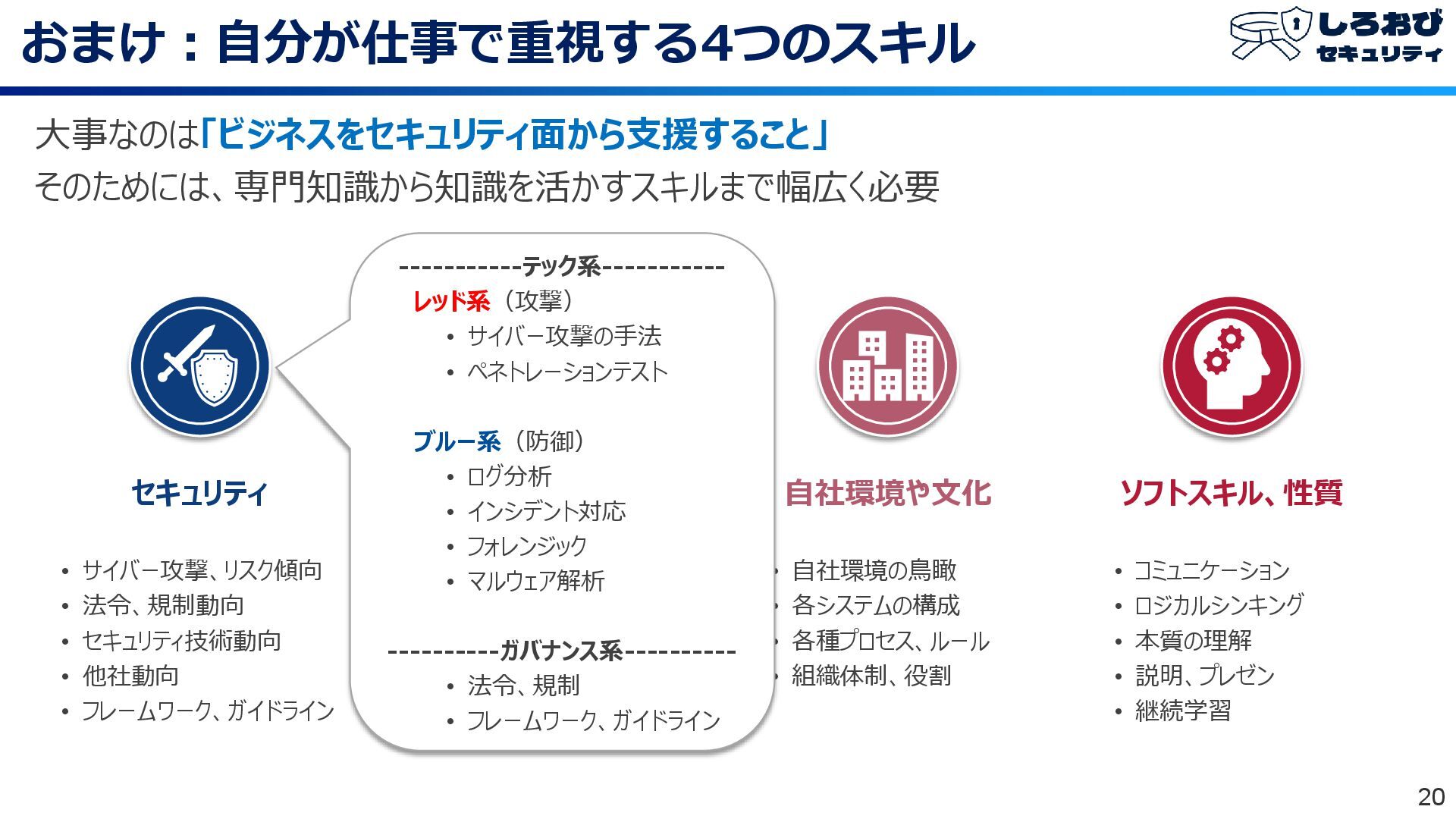 おまけ:自分が仕事で重視する4つのスキル 19 大事なのは「ビジネスをセキュリティ面から支援すること」 そのためには、専門知識から知識を活かすスキルまで幅広く必要 • コミュニケーション • ロジカルシンキング • 本質の理解