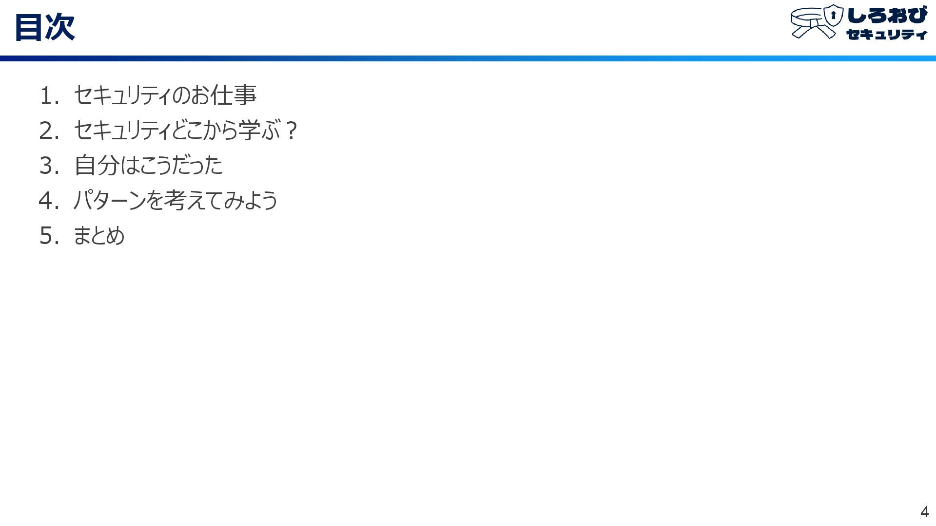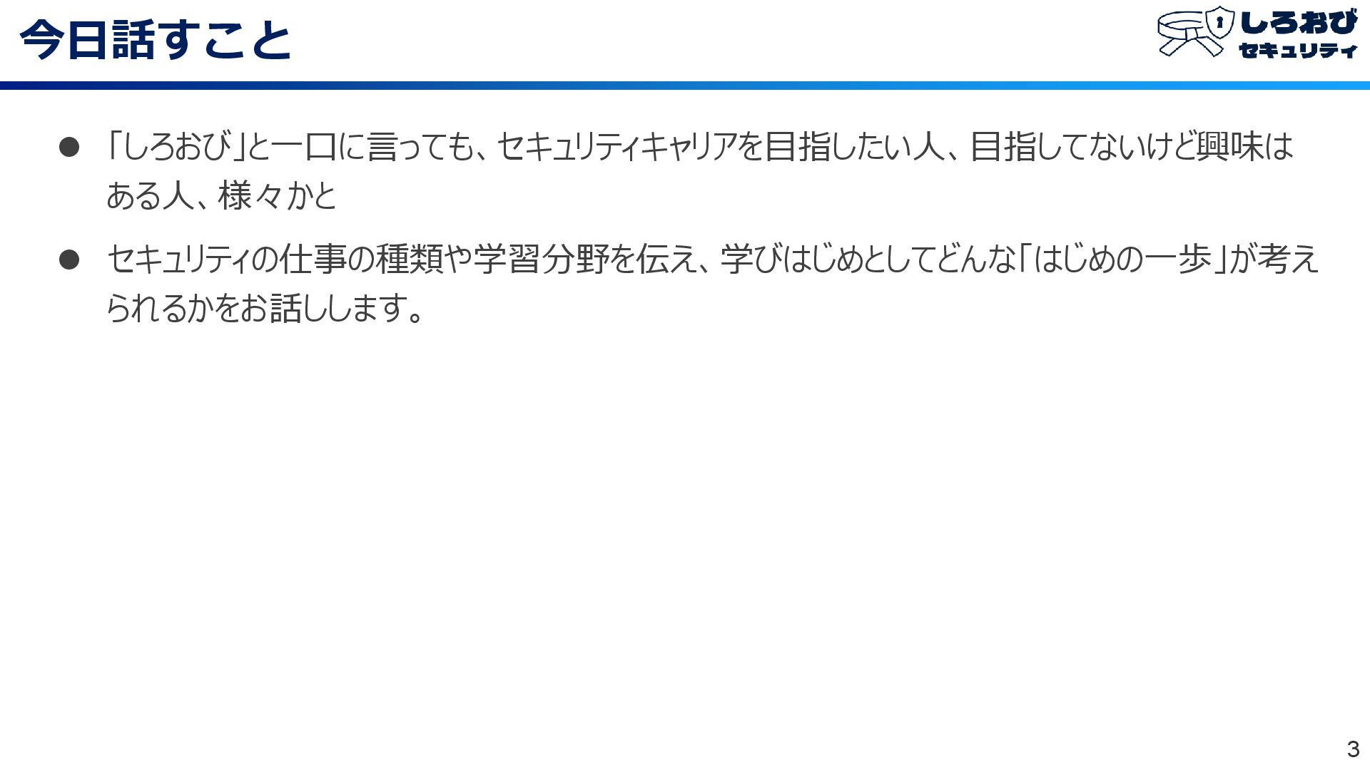 今日話すこと 3 ⚫ 「しろおび」と一口に言っても、セキュリティキャリアを目指したい人、目指してないけど興味は ある人、様々かと ⚫ セキュリティの仕事の種類や学習分野を伝え、学びはじめとしてどんな「はじめの一歩」が考え られるかをお話しします。