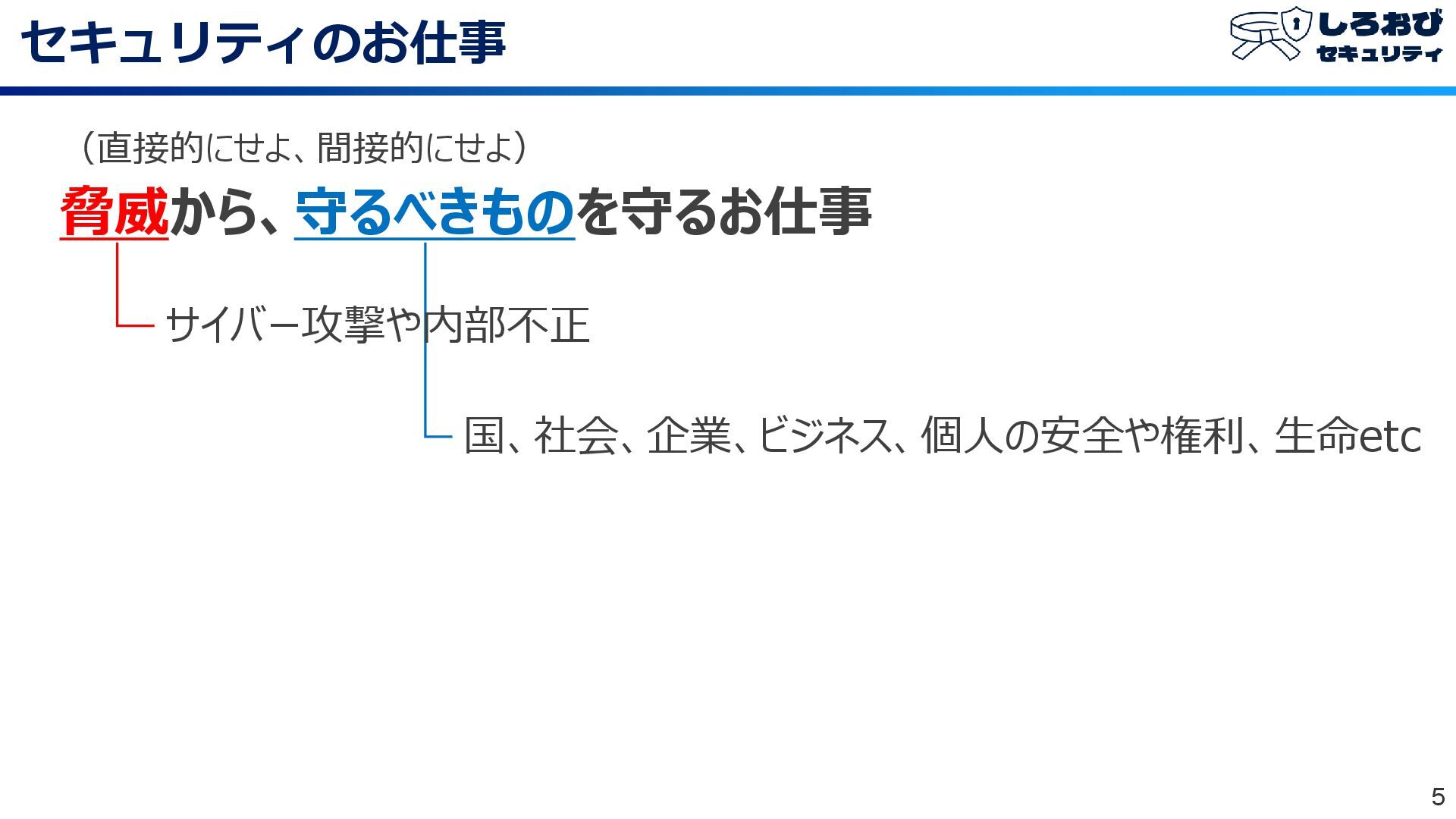 セキュリティのお仕事 5 (直接的にせよ、間接的にせよ) 脅威から、守るべきものを守るお仕事 国、社会、企業、ビジネス、個人の安全や権利、生命etc サイバー攻撃や内部不正