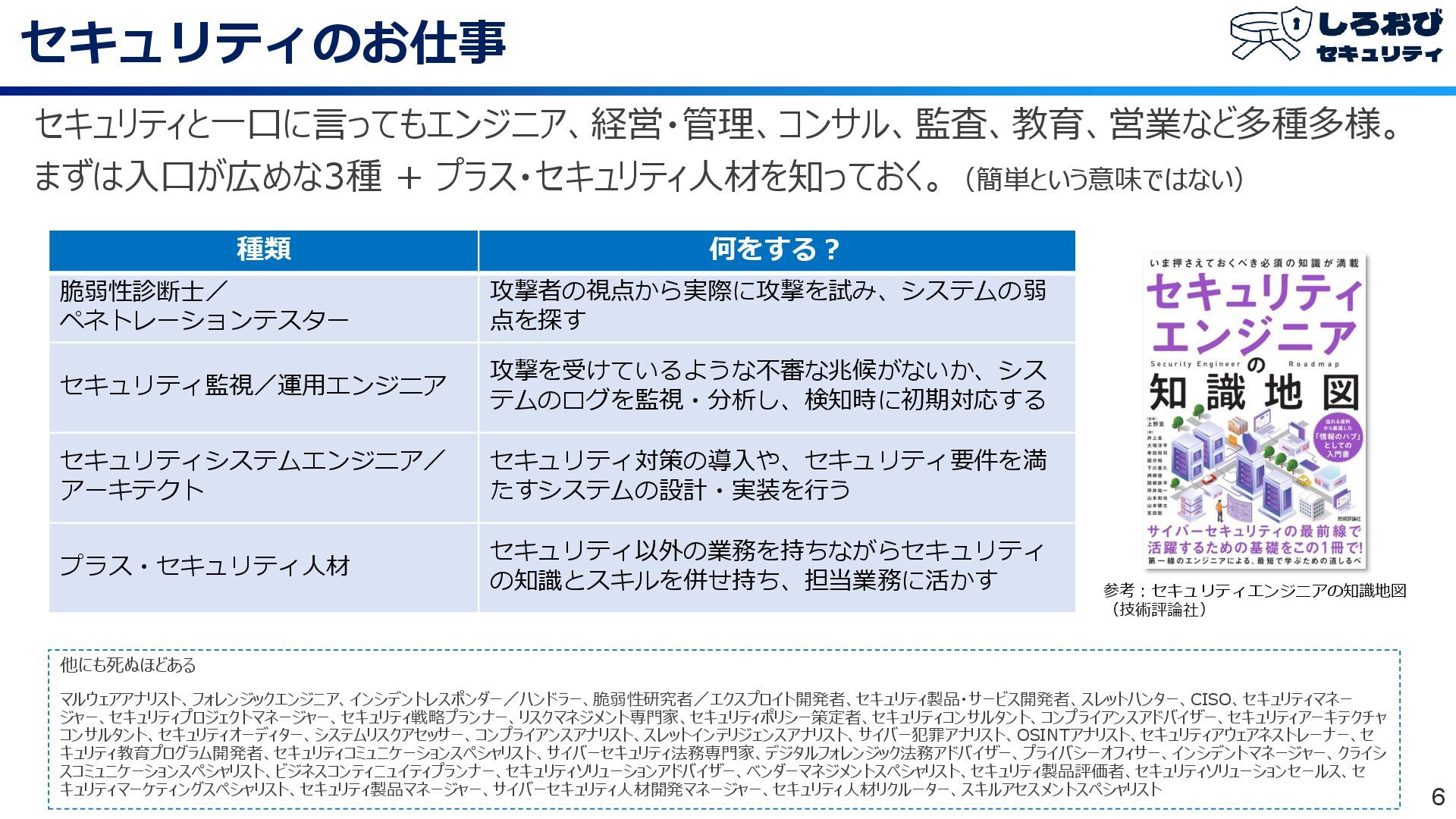 攻撃者の視点から実際に攻撃を試み、システムの弱 点を探す セキュリティ監視/運用エンジニア 攻撃を受けているような不審な兆候がないか、シス テムのログを監視・分析し、検知時に初期対応する セキュリティシステムエンジニア/ アーキテクト セキュリティ対策の導入や、セキュリティ要件を満 たすシステムの設計・実装を行う プラス・セキュリティ人材 セキュリティ以外の業務を持ちながらセキュリティ の知識とスキルを併せ持ち、担当業務に活かす 他にも死ぬほどある マルウェアアナリスト、フォレンジックエンジニア、インシデントレスポンダー/ハンドラー、脆弱性研究者/エクスプロイト開発者、セキュリティ製品・サービス開発者、スレットハンター、CISO、セキュリティマネー ジャー、セキュリティプロジェクトマネージャー、セキュリティ戦略プランナー、リスクマネジメント専門家、セキュリティポリシー策定者、セキュリティコンサルタント、コンプライアンスアドバイザー、セキュリティアーキテクチャ コンサルタント、セキュリティオーディター、システムリスクアセッサー、コンプライアンスアナリスト、スレットインテリジェンスアナリスト、サイバー犯罪アナリスト、OSINTアナリスト、セキュリティアウェアネストレーナー、セ キュリティ教育プログラム開発者、セキュリティコミュニケーションスペシャリスト、サイバーセキュリティ法務専門家、デジタルフォレンジック法務アドバイザー、プライバシーオフィサー、インシデントマネージャー、クライシ スコミュニケーションスペシャリスト、ビジネスコンティニュイティプランナー、セキュリティソリューションアドバイザー、ベンダーマネジメントスペシャリスト、セキュリティ製品評価者、セキュリティソリューションセールス、セ キュリティマーケティングスペシャリスト、セキュリティ製品マネージャー、サイバーセキュリティ人材開発マネージャー、セキュリティ人材リクルーター、スキルアセスメントスペシャリスト 参考:セキュリティエンジニアの知識地図 (技術評論社)