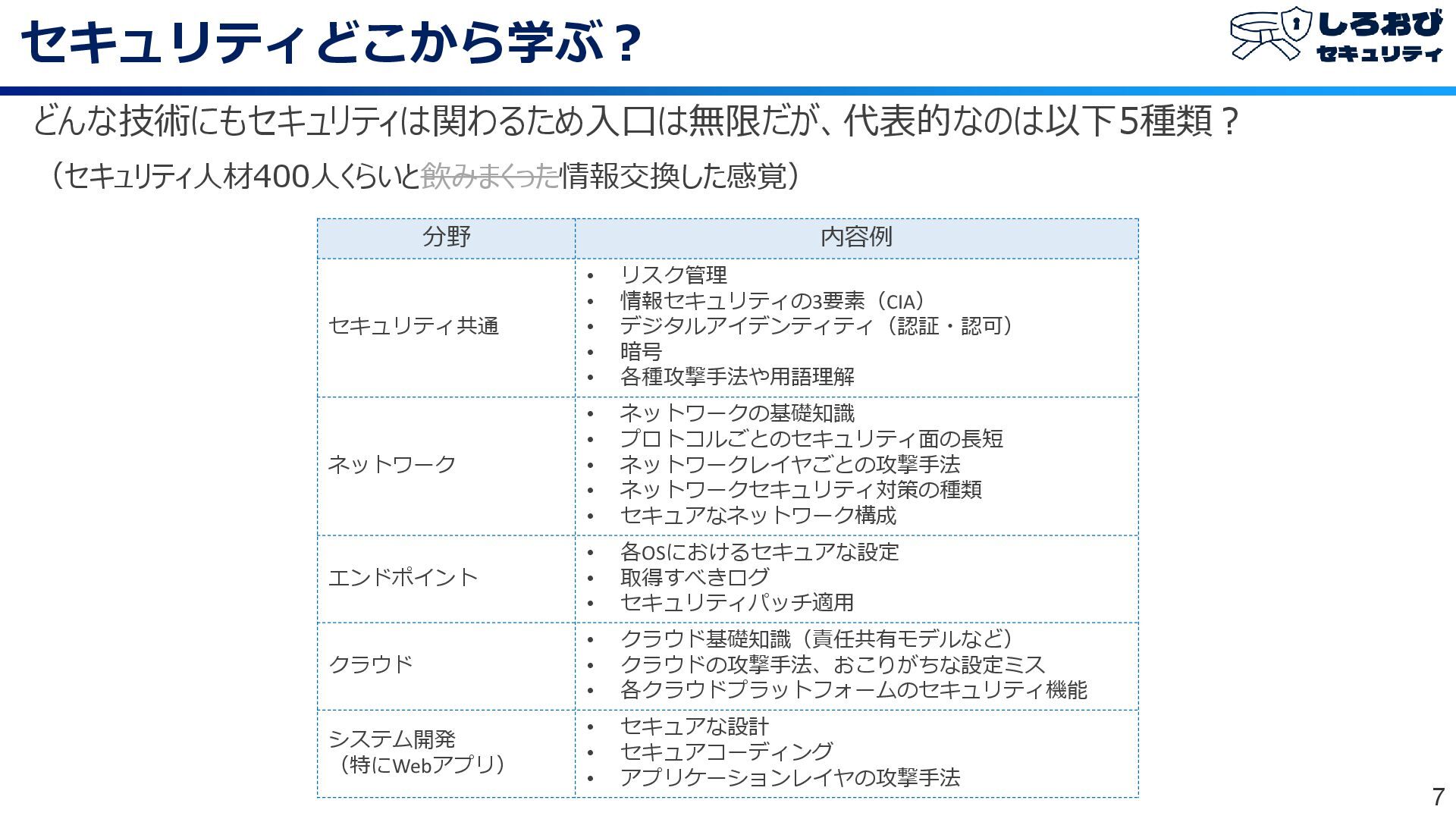 セキュリティどこから学ぶ? 7 どんな技術にもセキュリティは関わるため入口は無限だが、代表的なのは以下5種類? (セキュリティ人材400人くらいと飲みまくった情報交換した感覚) 分野 内容例 セキュリティ共通 • リスク管理 •