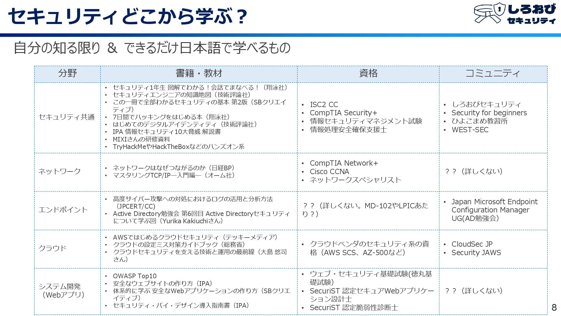 セキュリティどこから学ぶ? 8 自分の知る限り & できるだけ日本語で学べるもの 分野 書籍・教材 資格 コミュニティ セキュリティ共通