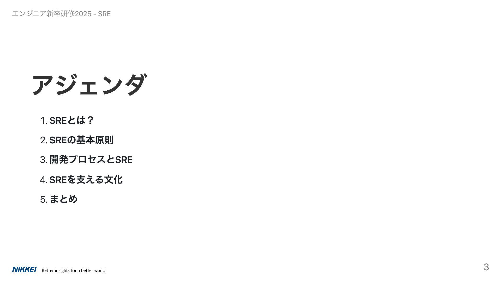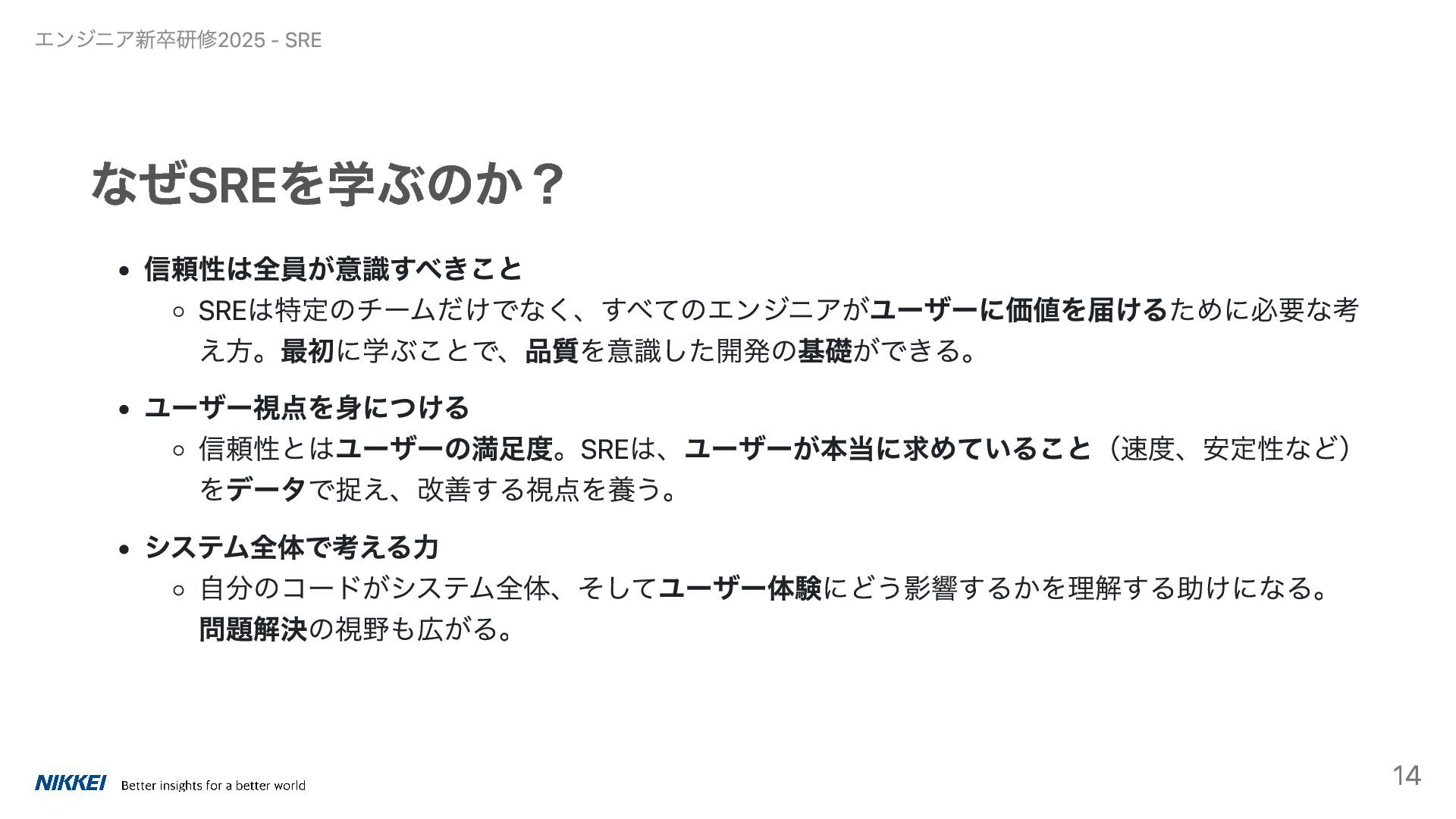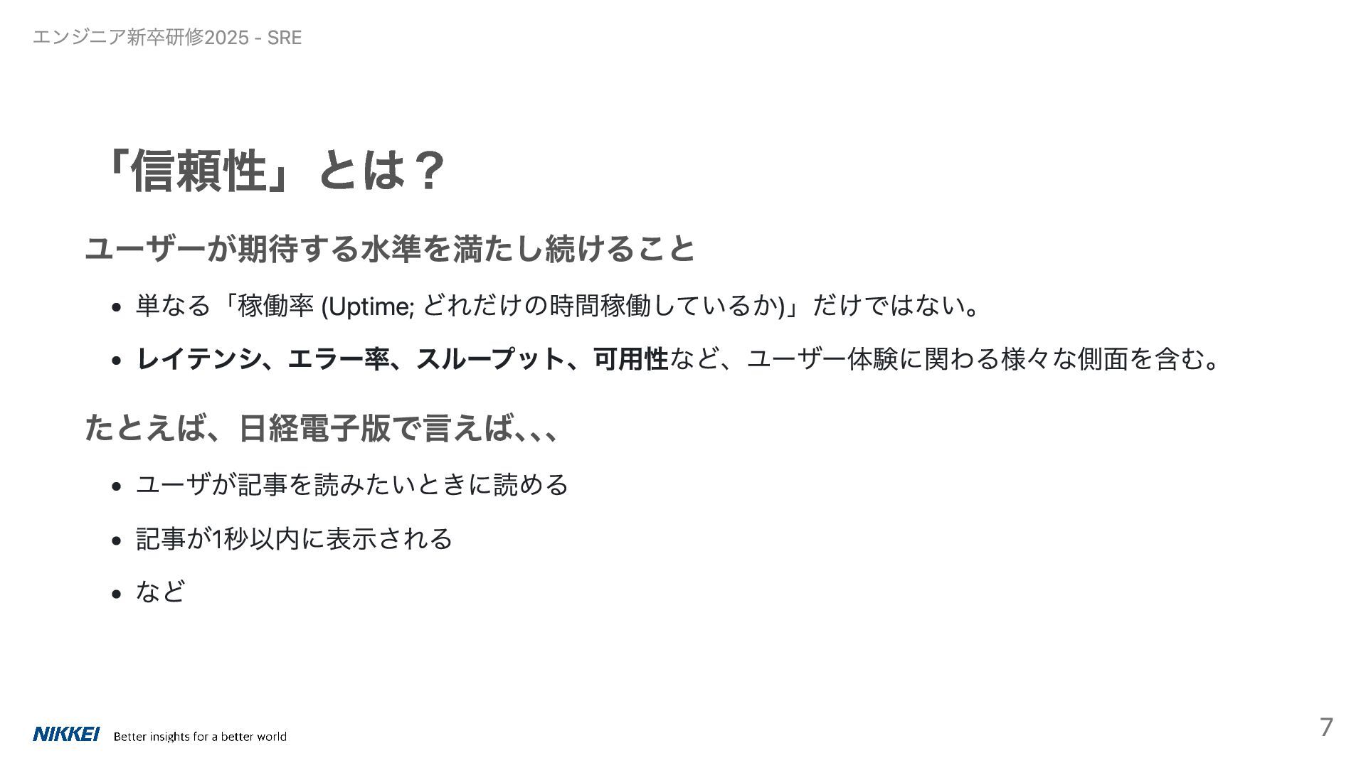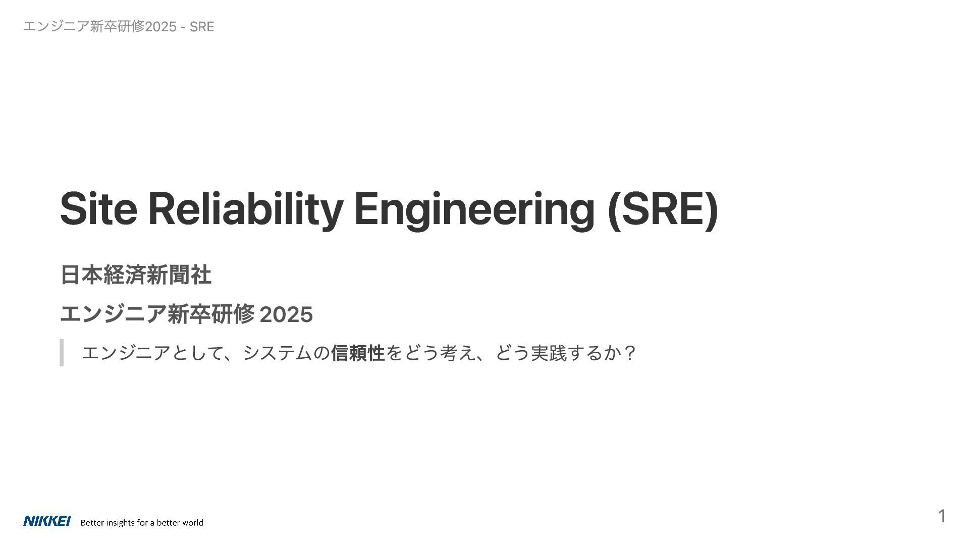 Site Reliability Engineering (SRE) 日本経済新聞社 エンジニア新卒研修 2025 エンジニアとして、システムの信頼性をどう考え、どう実践するか? エンジニア新卒研修2025 -