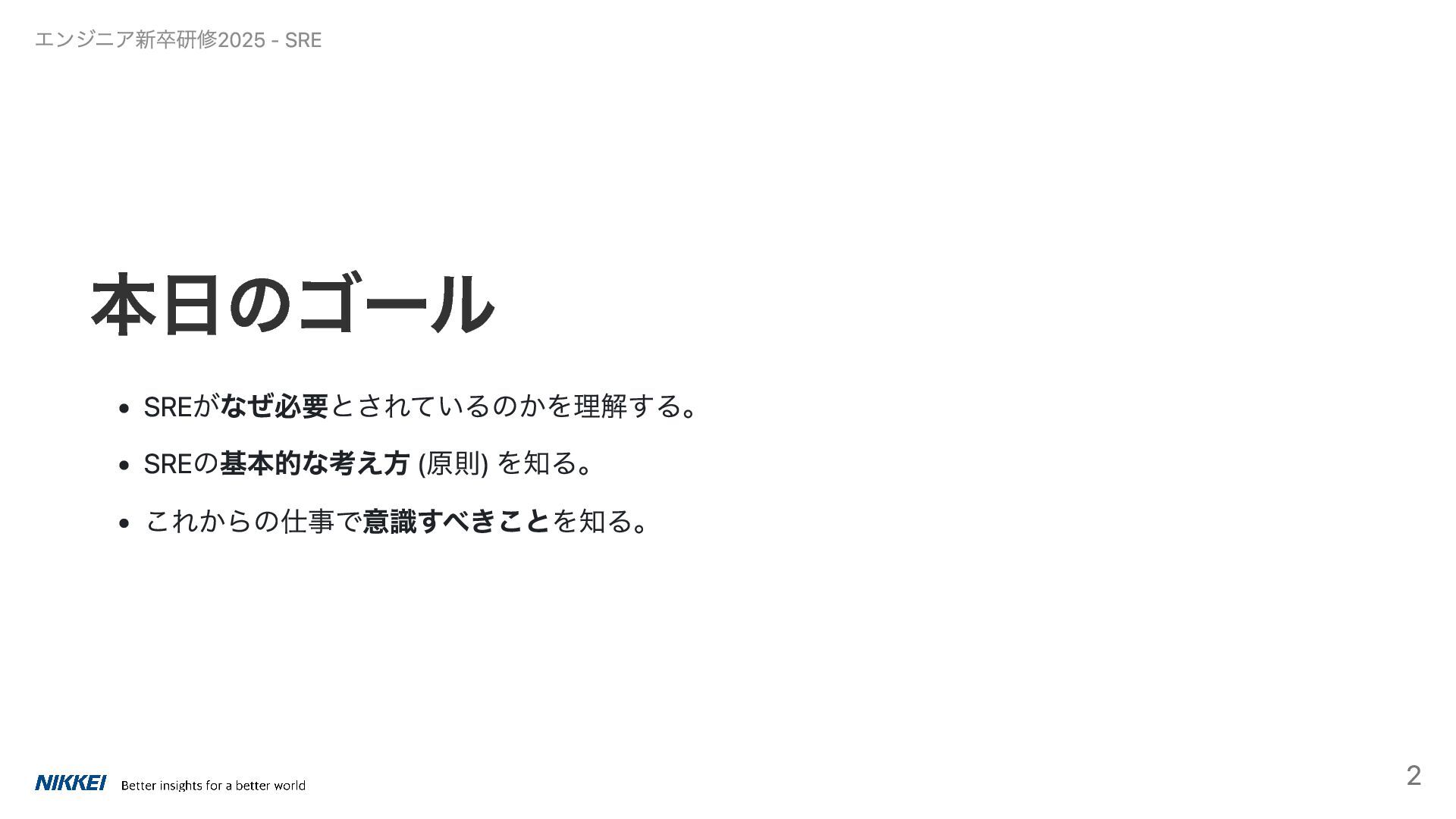 本日のゴール SREがなぜ必要とされているのかを理解する。 SREの基本的な考え方 (原則) を知る。 これからの仕事で意識すべきことを知る。 エンジニア新卒研修2025 - SRE 2
