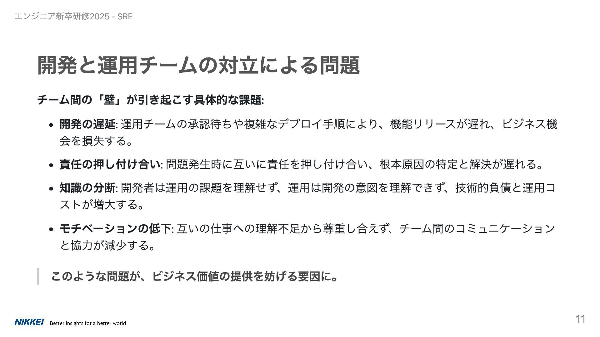 モチベーションの低下: 互いの仕事への理解不足から尊重し合えず、チーム間のコミュニケーション と協力が減少する。 このような問題が、ビジネス価値の提供を妨げる要因に。 エンジニア新卒研修2025 - SRE 11