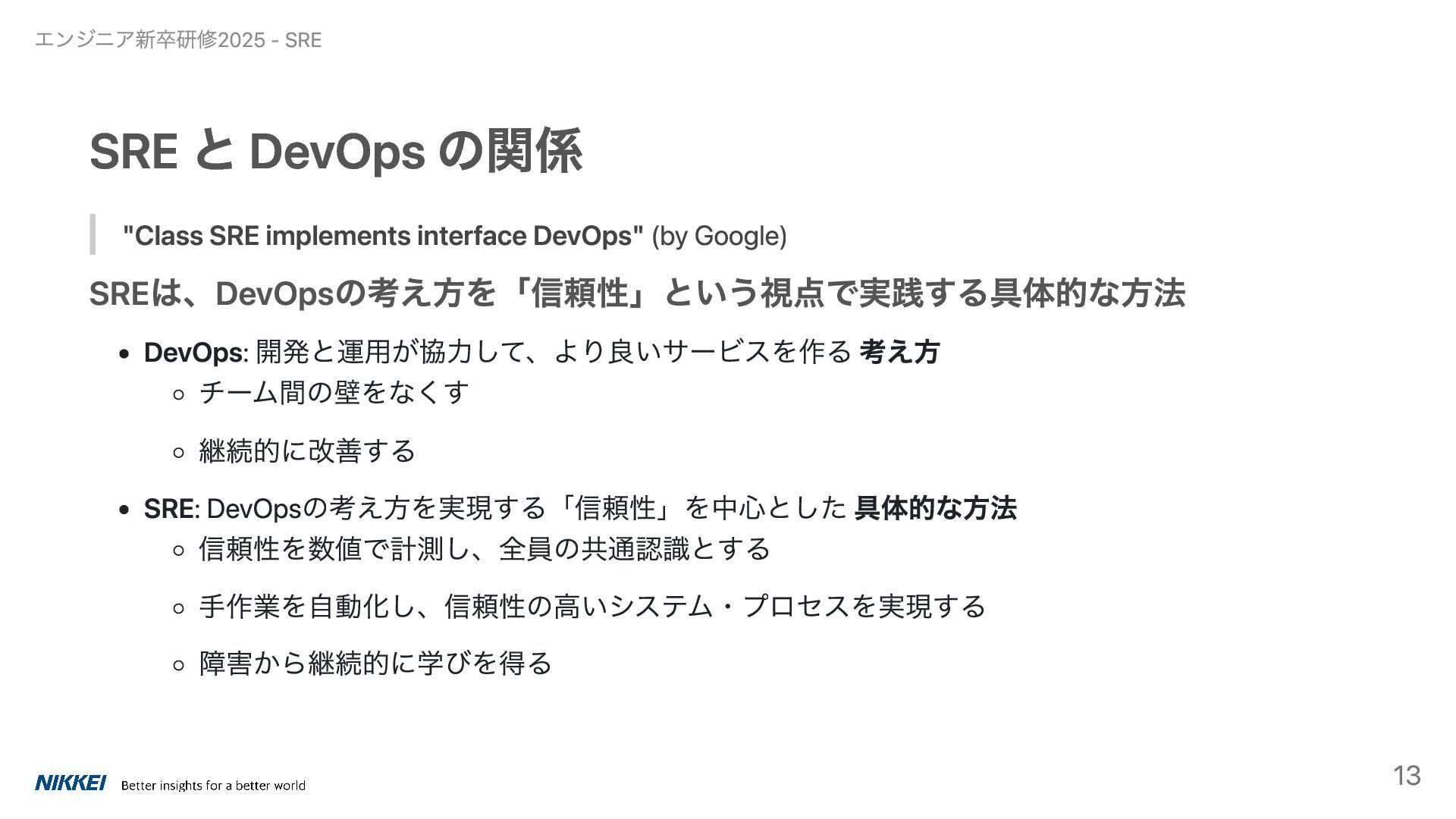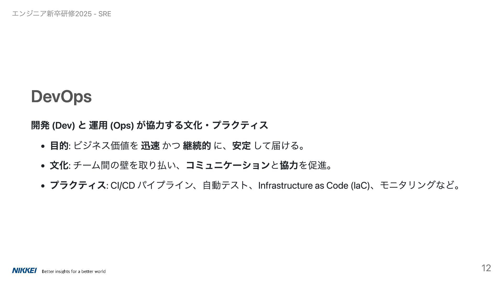 かつ 継続的 に、安定 して届ける。 文化: チーム間の壁を取り払い、コミュニケーションと協力を促進。 プラクティス: CI/CD パイプライン、自動テスト、Infrastructure as Code (IaC)、モニタリングなど。 エンジニア新卒研修2025 - SRE 12