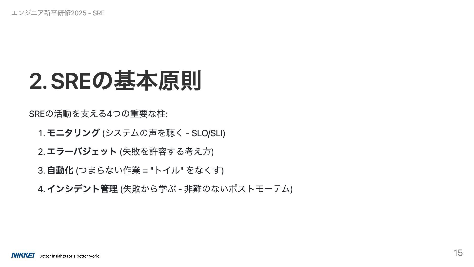 (失敗を許容する考え方) 3. 自動化 (つまらない作業 = "トイル" をなくす) 4. インシデント管理 (失敗から学ぶ - 非難のないポストモーテム) エンジニア新卒研修2025 - SRE 15