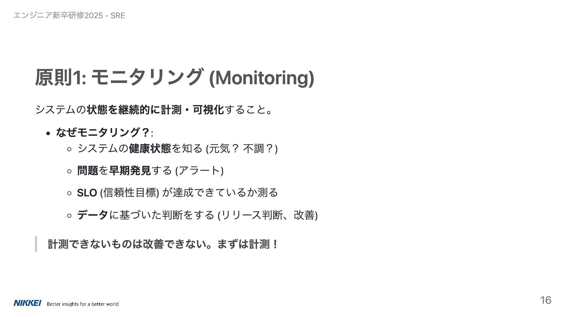 SLO (信頼性目標) が達成できているか測る データに基づいた判断をする (リリース判断、改善) 計測できないものは改善できない。まずは計測! エンジニア新卒研修2025 - SRE 16