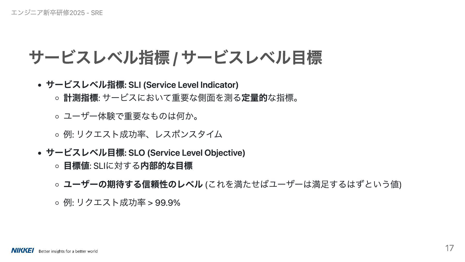ユーザー体験で重要なものは何か。 例: リクエスト成功率、レスポンスタイム サービスレベル目標: SLO (Service Level Objective) 目標値: SLIに対する内部的な目標 ユーザーの期待する信頼性のレベル (これを満たせばユーザーは満足するはずという値) 例: リクエスト成功率 > 99.9% エンジニア新卒研修2025 - SRE 17