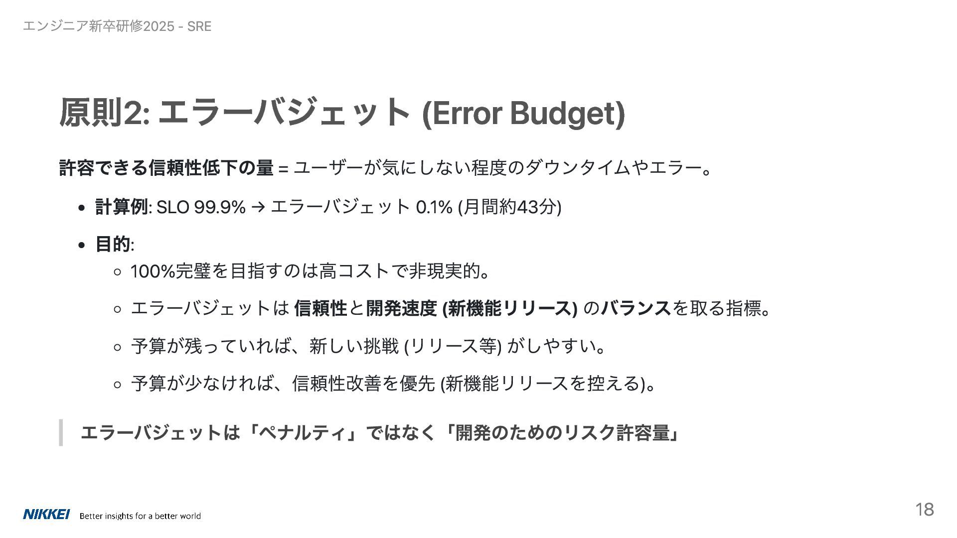 → エラーバジェット 0.1% (月間約43分) 目的: 100%完璧を目指すのは高コストで非現実的。 エラーバジェットは 信頼性と開発速度 (新機能リリース) のバランスを取る指標。 予算が残っていれば、新しい挑戦 (リリース等) がしやすい。 予算が少なければ、信頼性改善を優先 (新機能リリースを控える)。 エラーバジェットは「ペナルティ」ではなく「開発のためのリスク許容量」 エンジニア新卒研修2025 - SRE 18