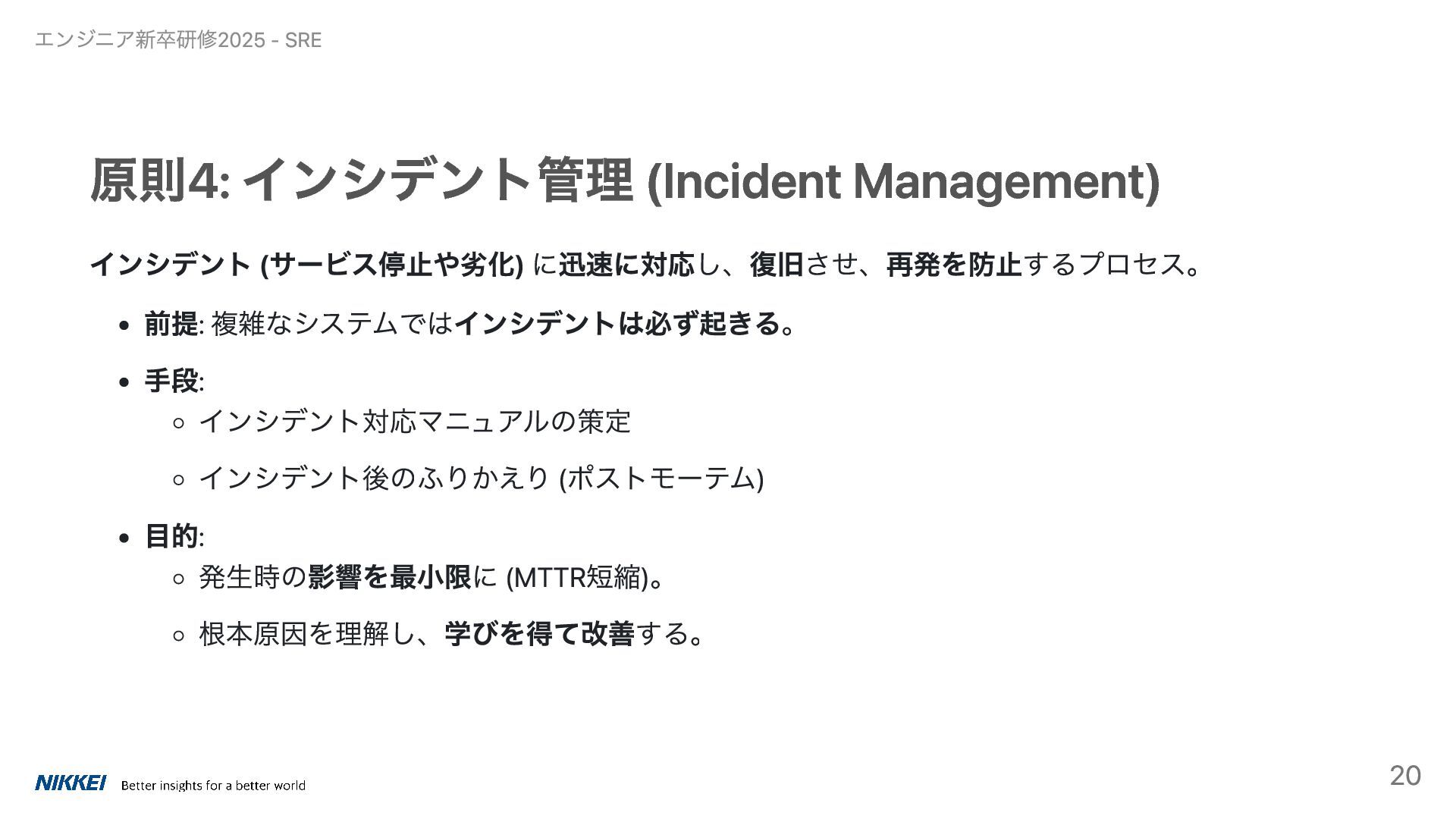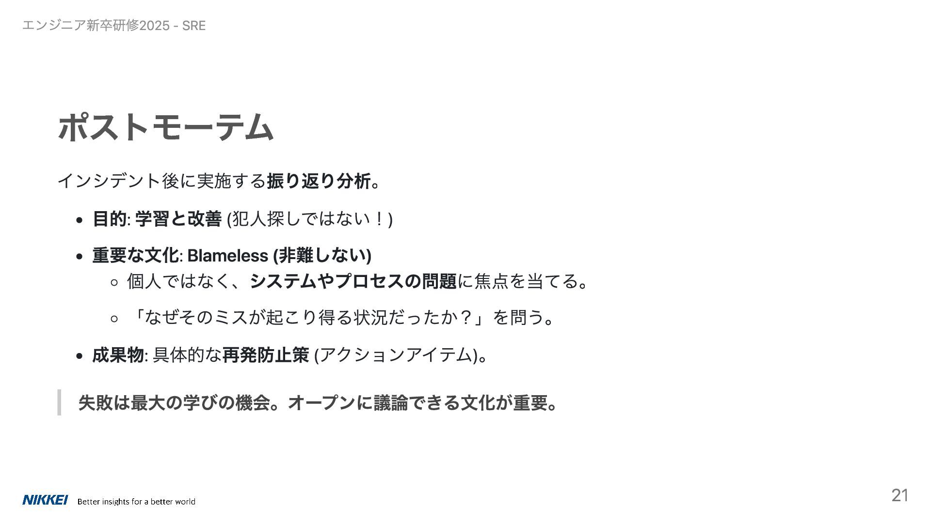 成果物: 具体的な再発防止策 (アクションアイテム)。 失敗は最大の学びの機会。オープンに議論できる文化が重要。 エンジニア新卒研修2025 - SRE 21