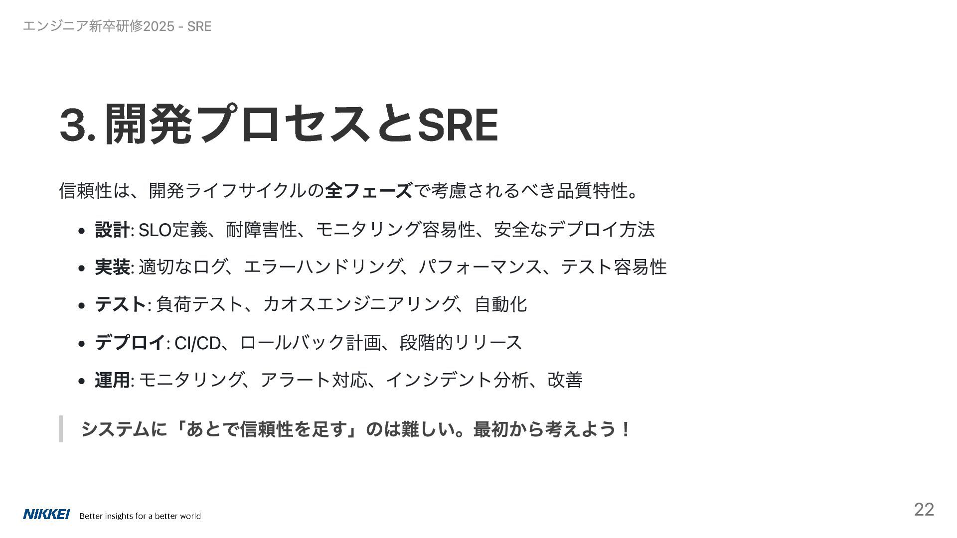 3. 開発プロセスとSRE 信頼性は、開発ライフサイクルの全フェーズで考慮されるべき品質特性。 設計: SLO定義、耐障害性、モニタリング容易性、安全なデプロイ方法 実装: 適切なログ、エラーハンドリング、パフォーマンス、テスト容易性 テスト: 負荷テスト、カオスエンジニアリング、自動化 デプロイ: