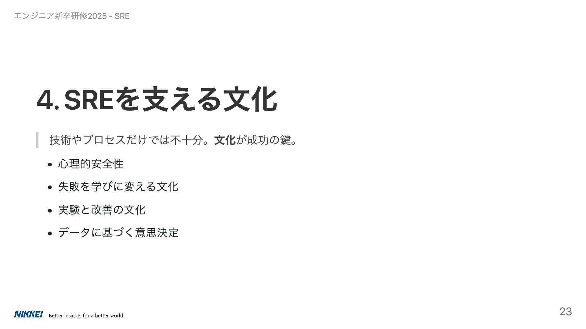 4. SREを支える文化 技術やプロセスだけでは不十分。文化が成功の鍵。 心理的安全性 失敗を学びに変える文化 実験と改善の文化 データに基づく意思決定 エンジニア新卒研修2025 - SRE