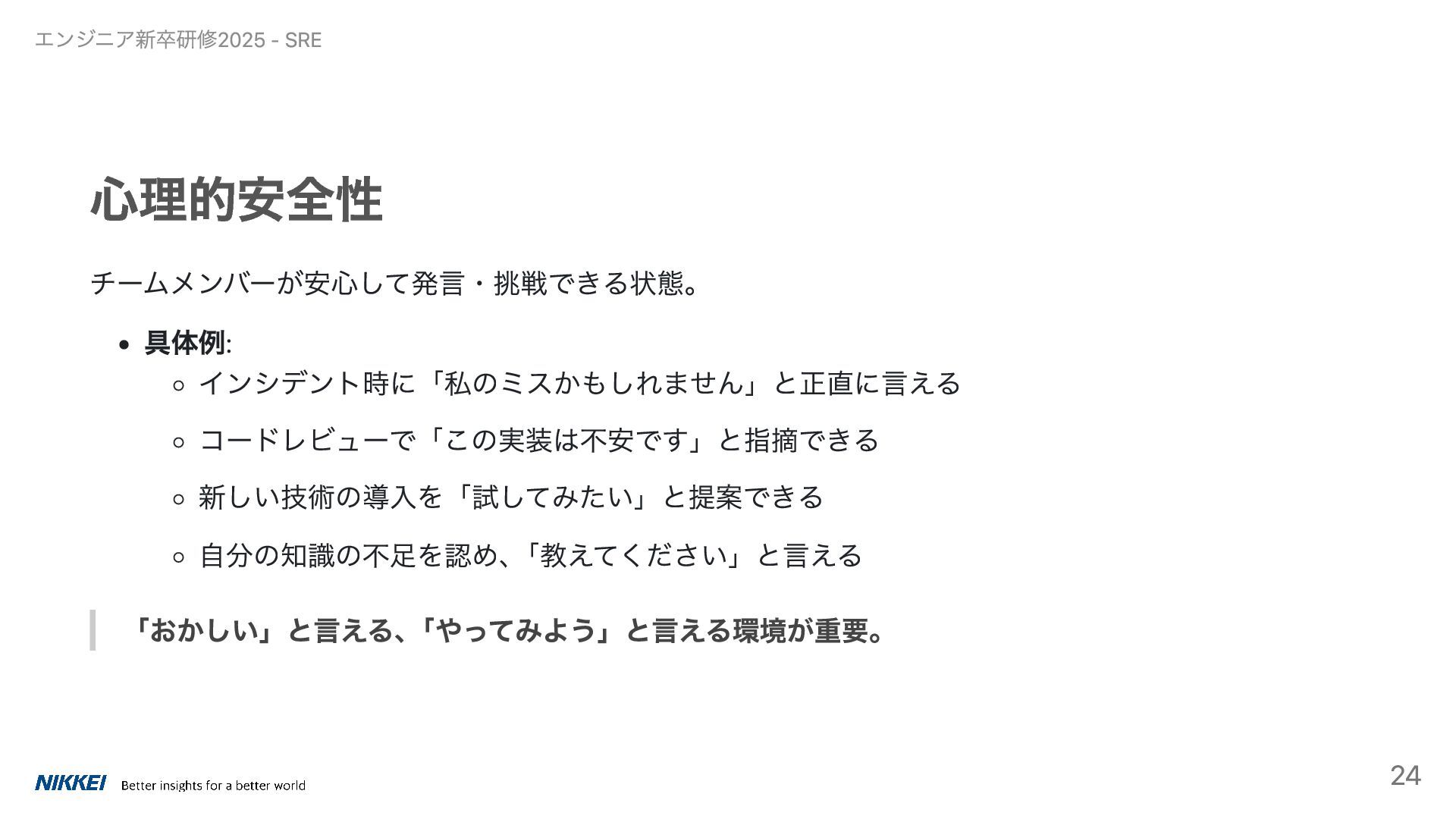 心理的安全性 チームメンバーが安心して発言・挑戦できる状態。 具体例: インシデント時に「私のミスかもしれません」と正直に言える コードレビューで「この実装は不安です」と指摘できる 新しい技術の導入を「試してみたい」と提案できる 自分の知識の不足を認め、 「教えてください」と言える 「おかしい」と言える、 「やってみよう」と言える環境が重要。