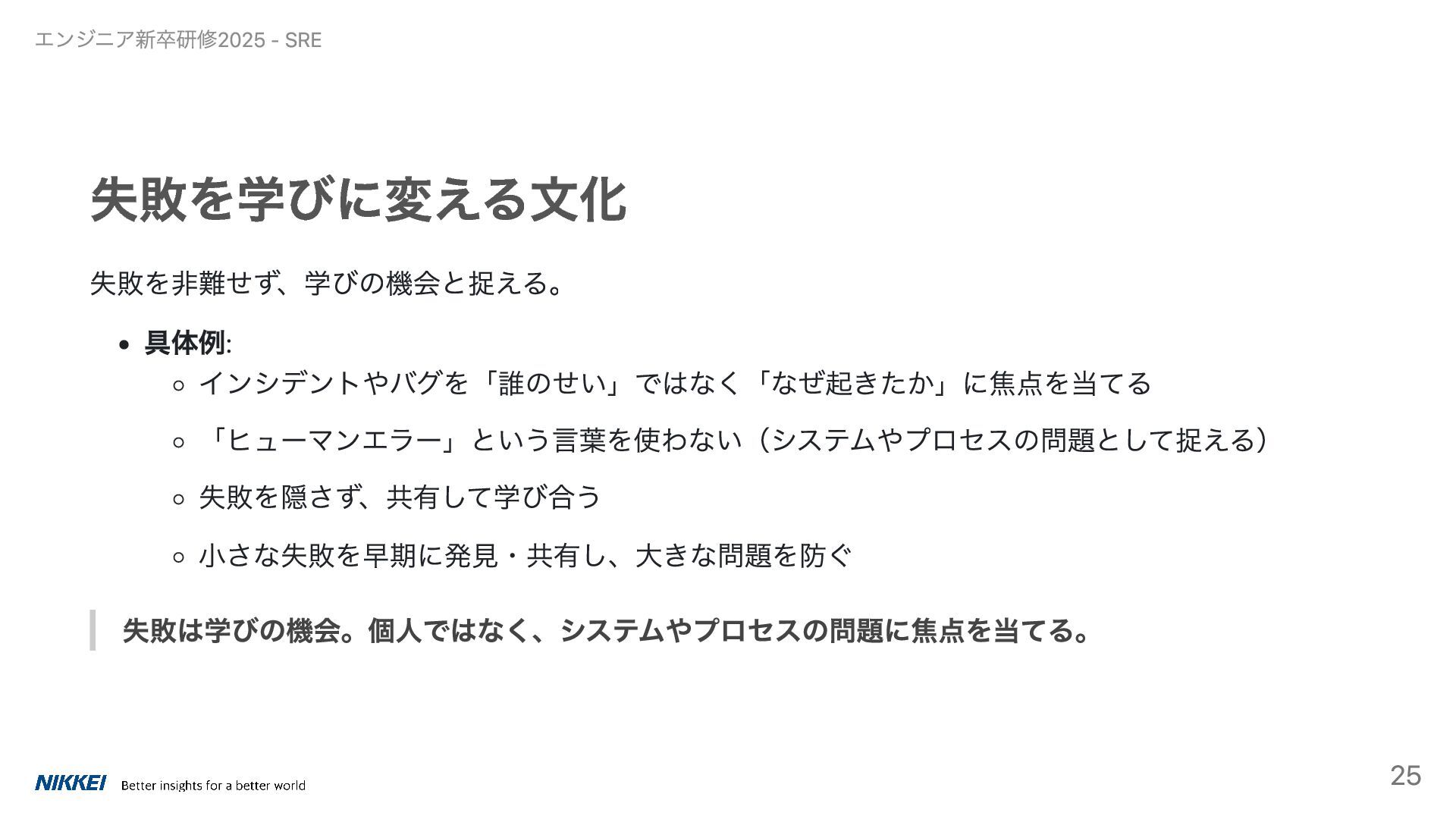 失敗を学びに変える文化 失敗を非難せず、学びの機会と捉える。 具体例: インシデントやバグを「誰のせい」ではなく「なぜ起きたか」に焦点を当てる 「ヒューマンエラー」という言葉を使わない(システムやプロセスの問題として捉える) 失敗を隠さず、共有して学び合う 小さな失敗を早期に発見・共有し、大きな問題を防ぐ 失敗は学びの機会。個人ではなく、システムやプロセスの問題に焦点を当てる。 エンジニア新卒研修2025 -