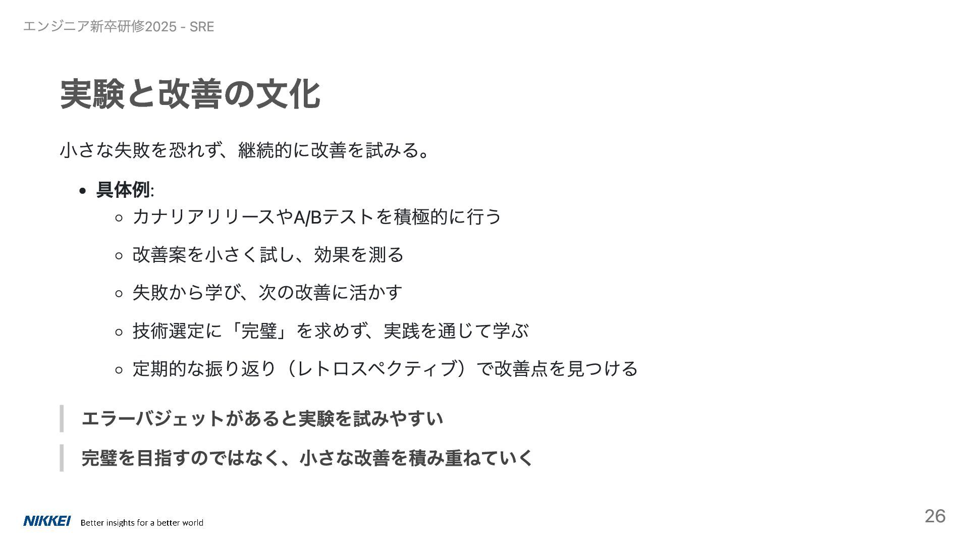 実験と改善の文化 小さな失敗を恐れず、継続的に改善を試みる。 具体例: カナリアリリースやA/Bテストを積極的に行う 改善案を小さく試し、効果を測る 失敗から学び、次の改善に活かす 技術選定に「完璧」を求めず、実践を通じて学ぶ 定期的な振り返り(レトロスペクティブ)で改善点を見つける エラーバジェットがあると実験を試みやすい 完璧を目指すのではなく、小さな改善を積み重ねていく