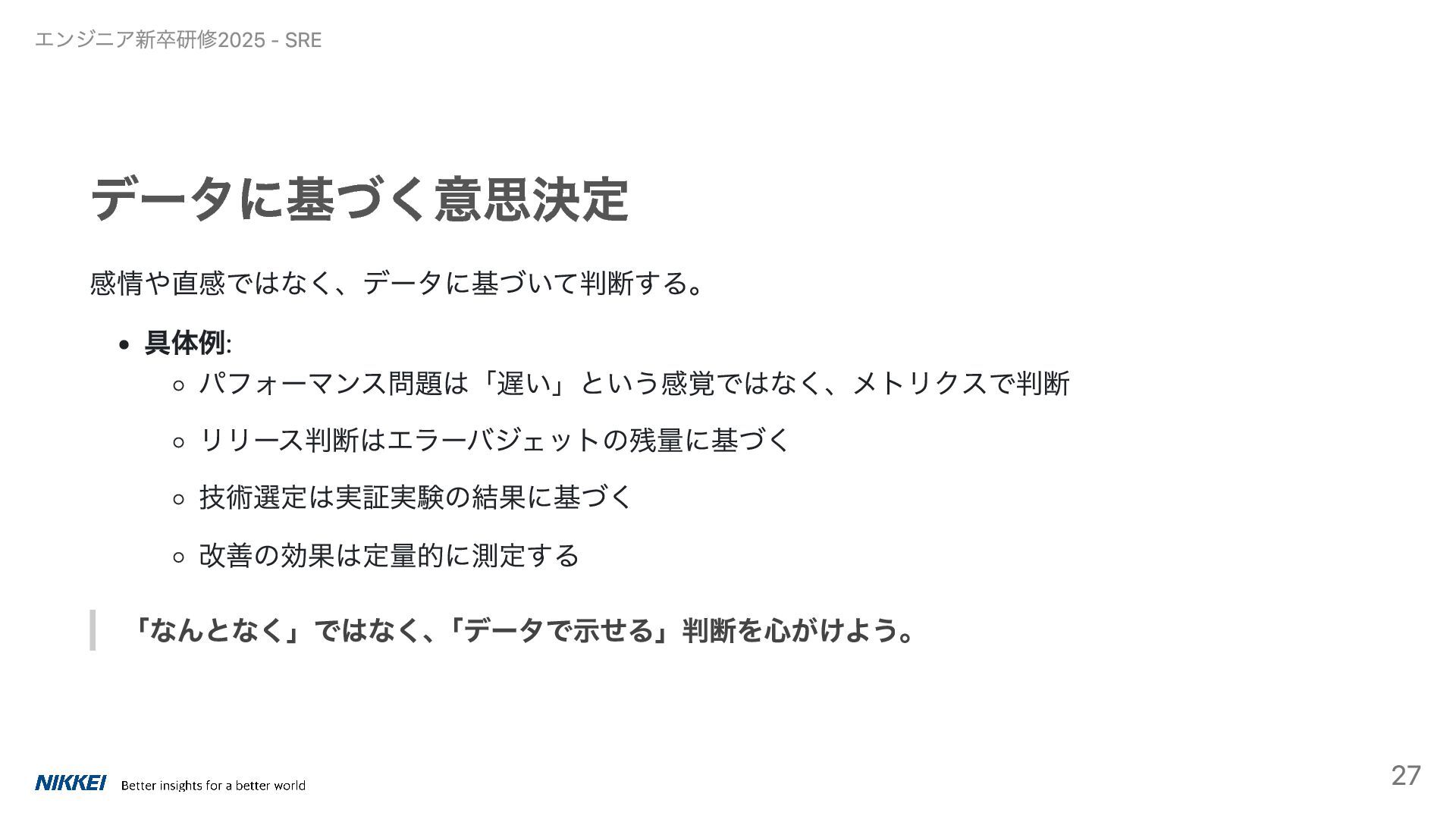データに基づく意思決定 感情や直感ではなく、データに基づいて判断する。 具体例: パフォーマンス問題は「遅い」という感覚ではなく、メトリクスで判断 リリース判断はエラーバジェットの残量に基づく 技術選定は実証実験の結果に基づく 改善の効果は定量的に測定する 「なんとなく」ではなく、 「データで示せる」判断を心がけよう。 エンジニア新卒研修2025