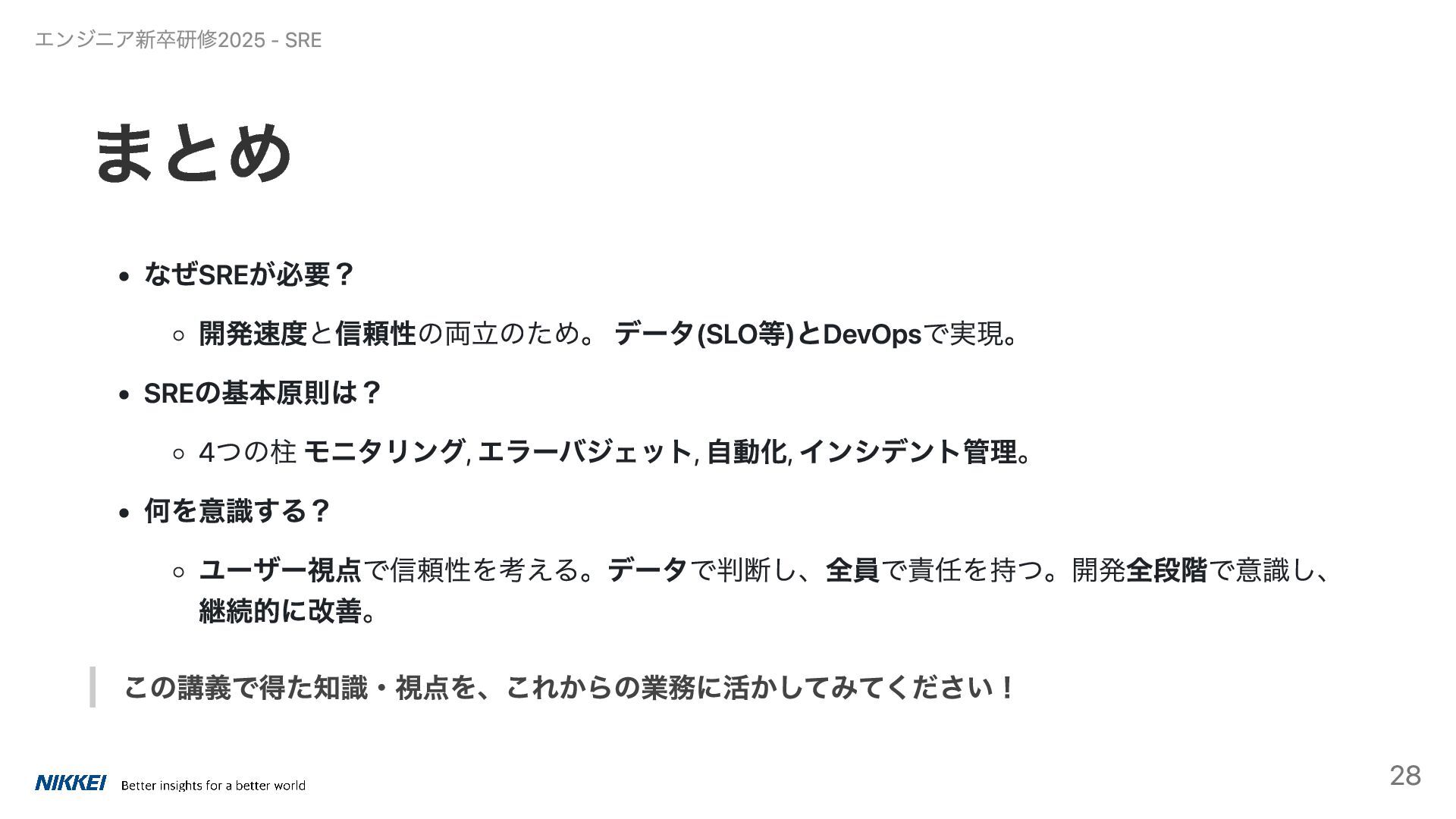 何を意識する? ユーザー視点で信頼性を考える。データで判断し、全員で責任を持つ。開発全段階で意識し、 継続的に改善。 この講義で得た知識・視点を、これからの業務に活かしてみてください! エンジニア新卒研修2025 - SRE 28