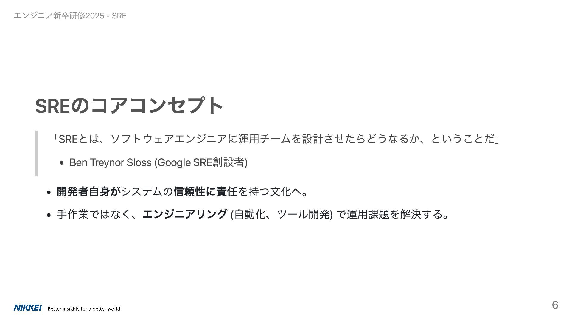 SREとは - Site Reliability Engineering ソフトウェアエンジニアリングの手法を運用に適用し、 スケーラブルで信頼性の高いシステムを構築・運用するアプローチ。 エンジニア新卒研修2025 - SRE