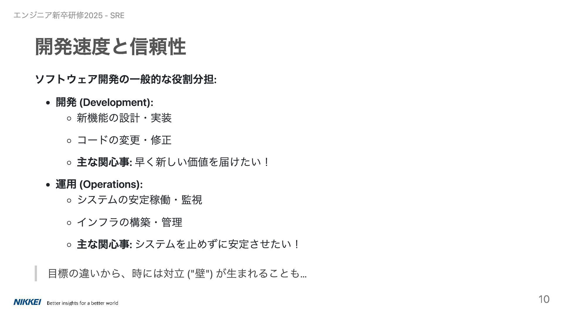 システムの安定稼働・監視 インフラの構築・管理 主な関心事: システムを止めずに安定させたい! 目標の違いから、時には対立 ("壁") が生まれることも… エンジニア新卒研修2025 - SRE 10
