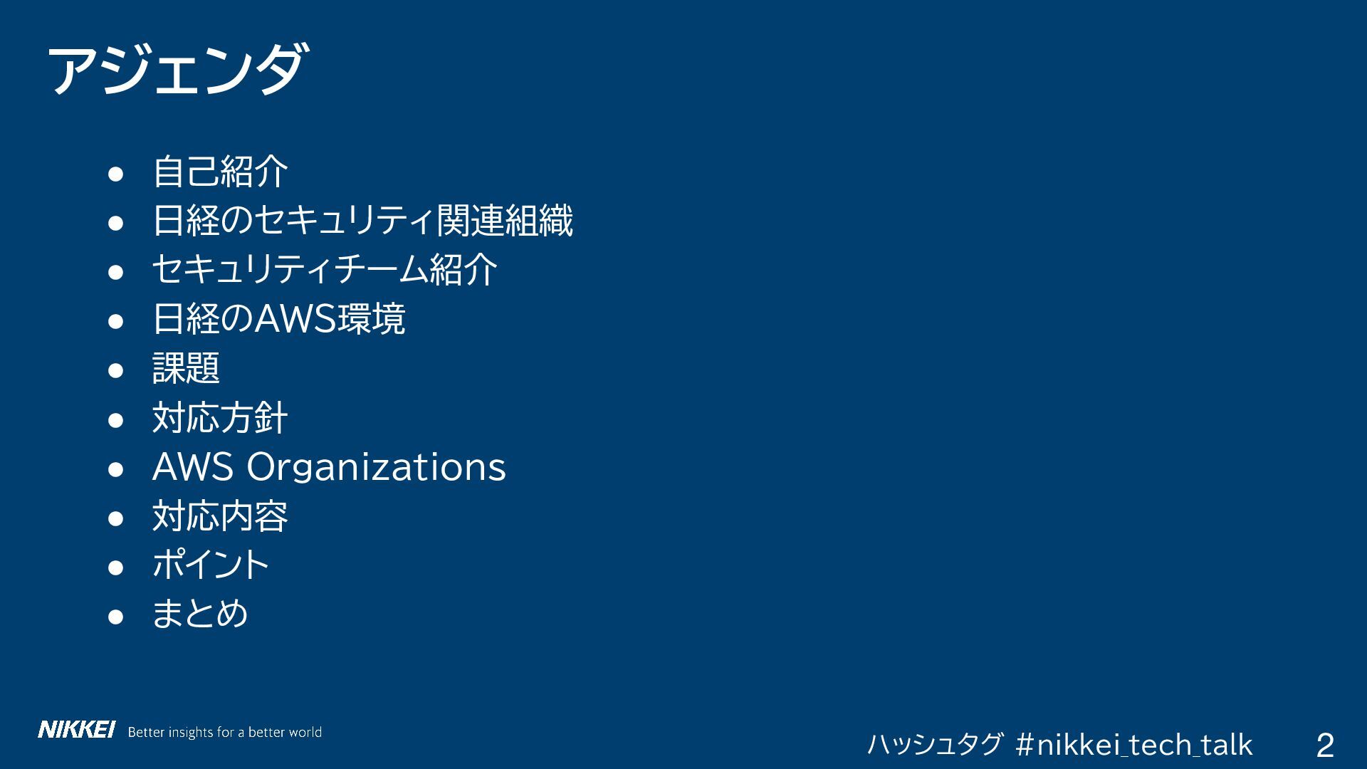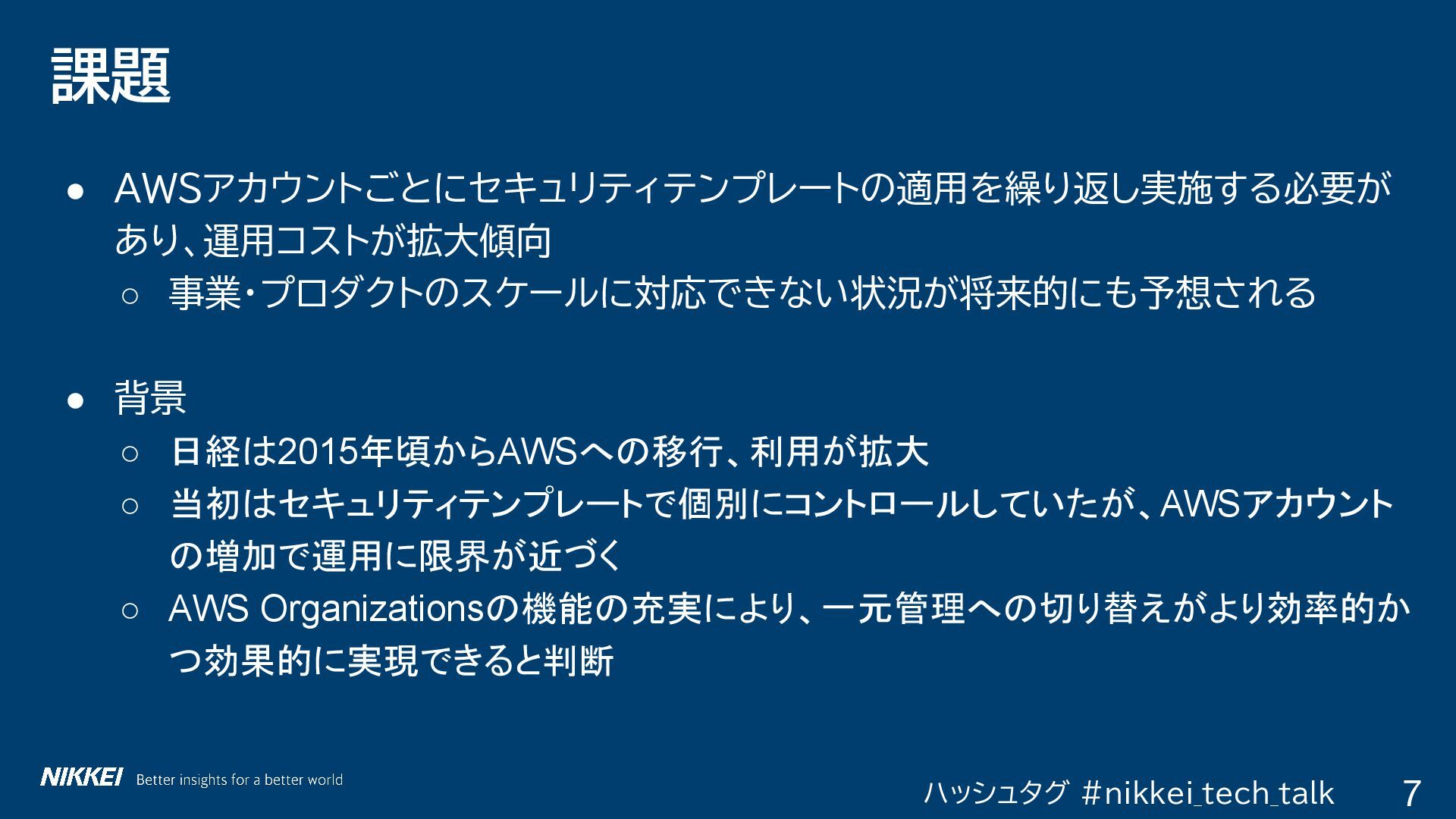 背景 ◦ 日経は2015年頃からAWSへの移行、利用が拡大 ◦ 当初はセキュリティテンプレートで個別にコントロールしていたが、AWSアカウント の増加で運用に限界が近づく ◦ AWS Organizationsの機能の充実により、一元管理への切り替えがより効率的か つ効果的に実現できると判断