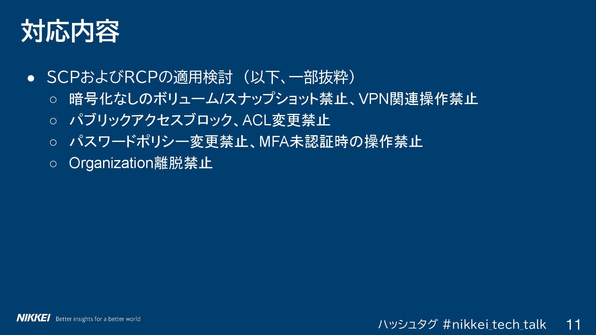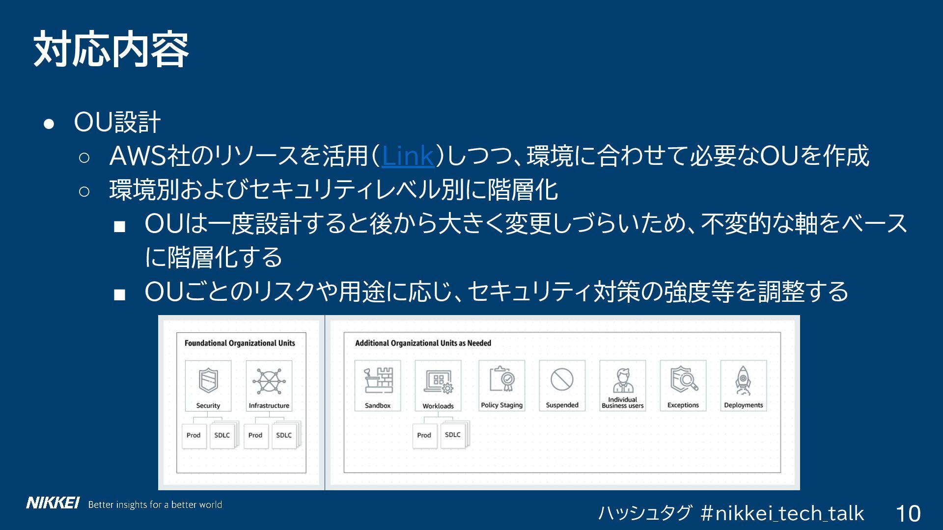 9. ハッシュタグ #nikkei_tech_talk 対応内容 10 • OU設計 ◦ AWS社のリソースを活用(Link)しつつ、環境に合わせて必要なOUを作成 ◦ 環境別およびセキュリティレベル別に階層化