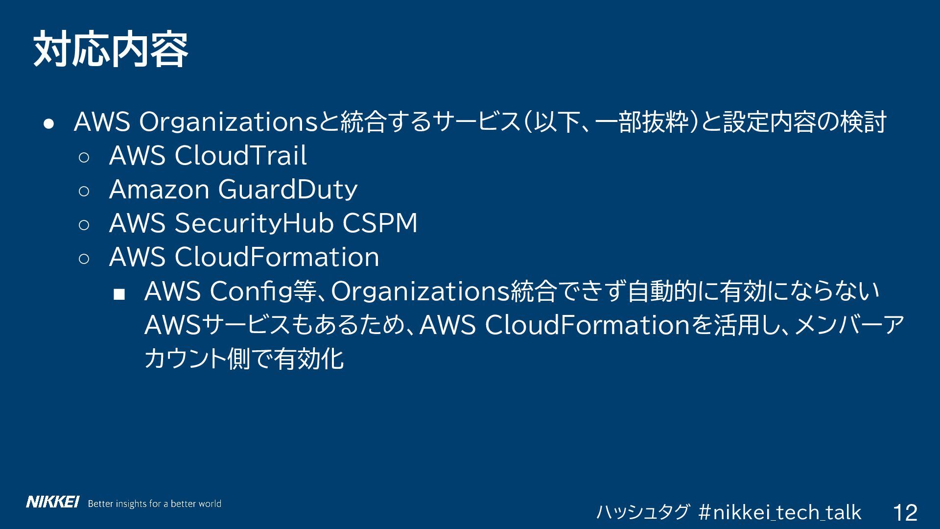10. ハッシュタグ #nikkei_tech_talk 対応内容 12 • AWS Organizationsと統合するサービス(以下、一部抜粋)と設定内容の検討 ◦ AWS CloudTrail