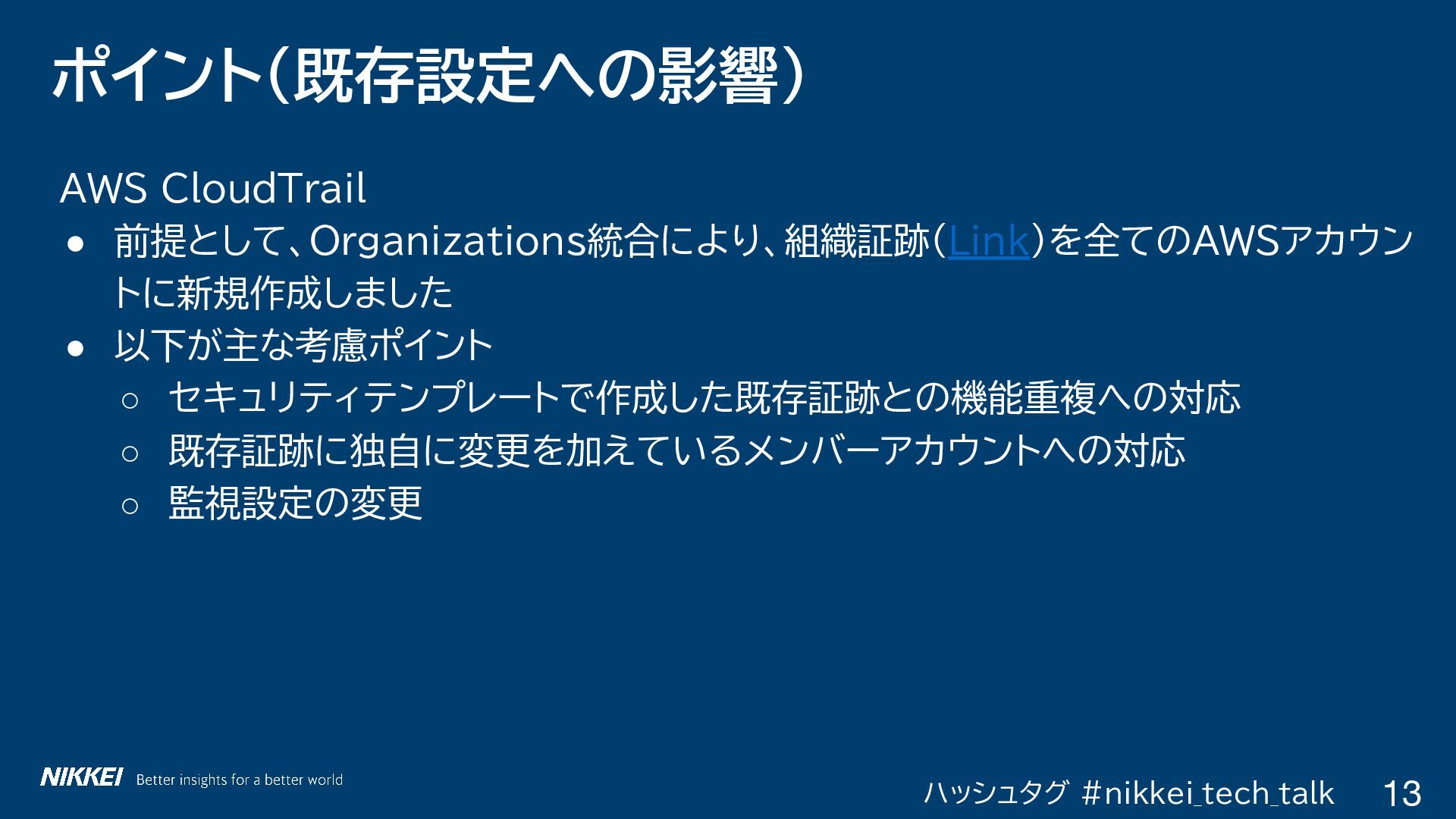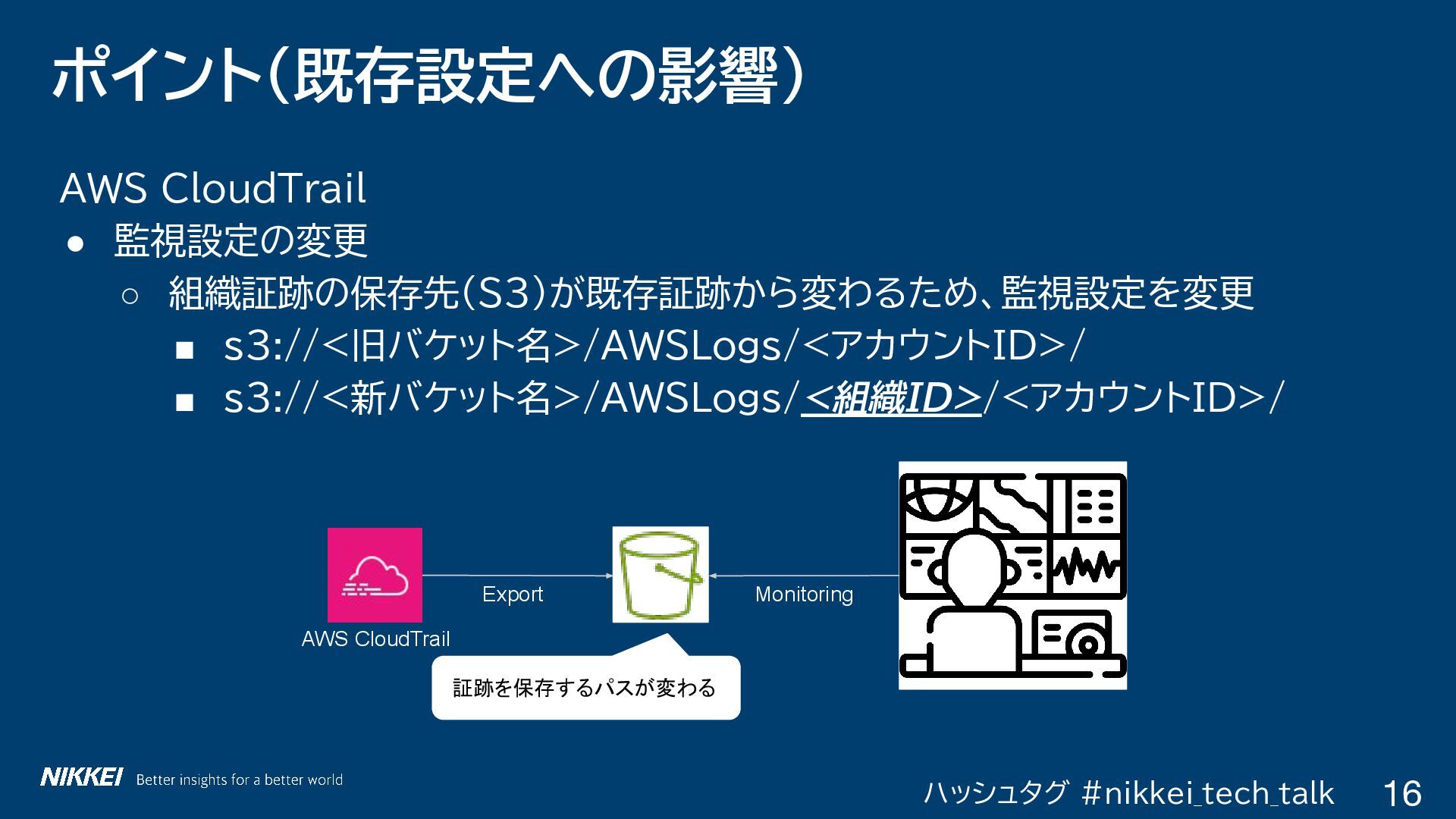 12. ハッシュタグ #nikkei_tech_talk ポイント(既存設定への影響) 15 AWS CloudTrail • 既存証跡に独自に変更を加えているメンバーアカウントへの対応 ◦ 既存証跡に変更を加えているメンバーアカウントの情報を取得し、個別対応を