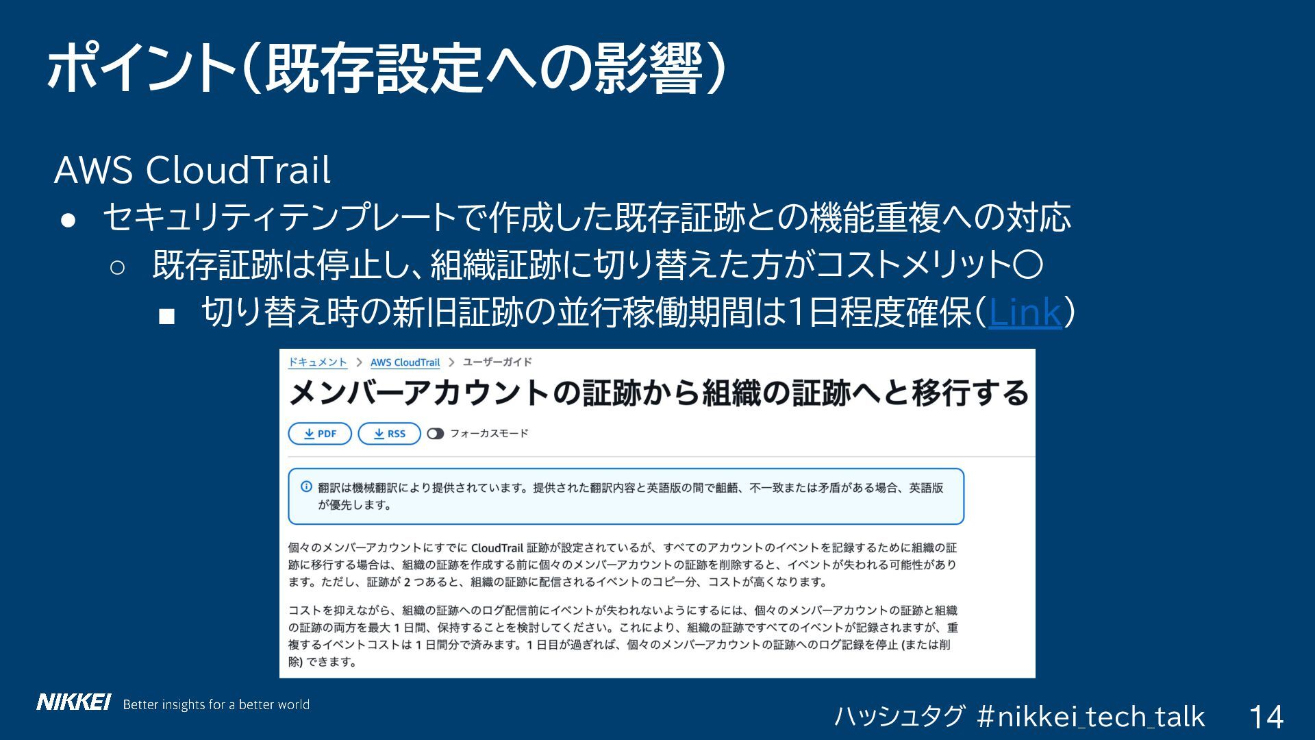 11. ハッシュタグ #nikkei_tech_talk ポイント(既存設定への影響) 13 AWS CloudTrail • 前提として、Organizations統合により、組織証跡(Link)を全てのAWSアカウン トに新規作成しました •