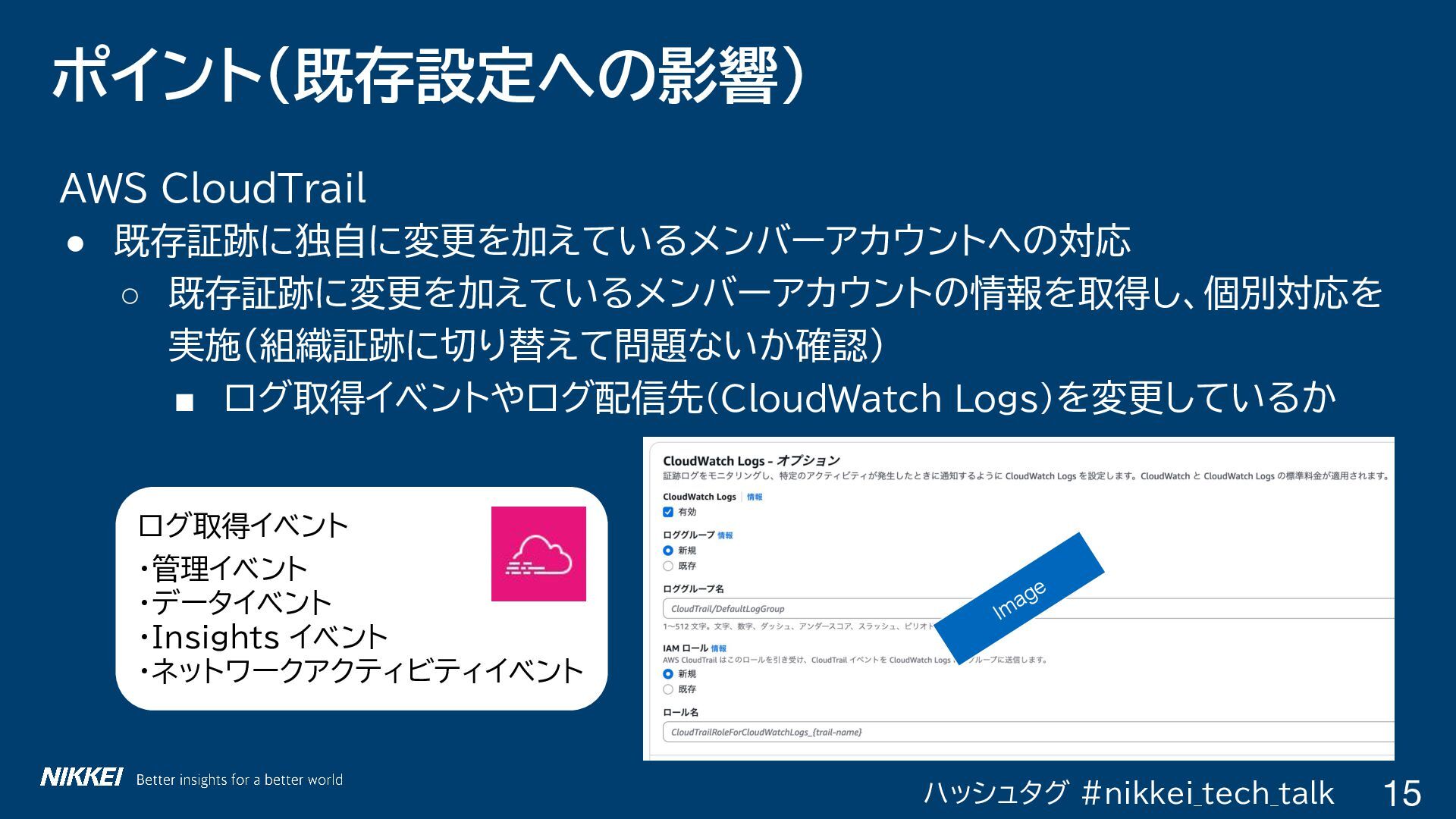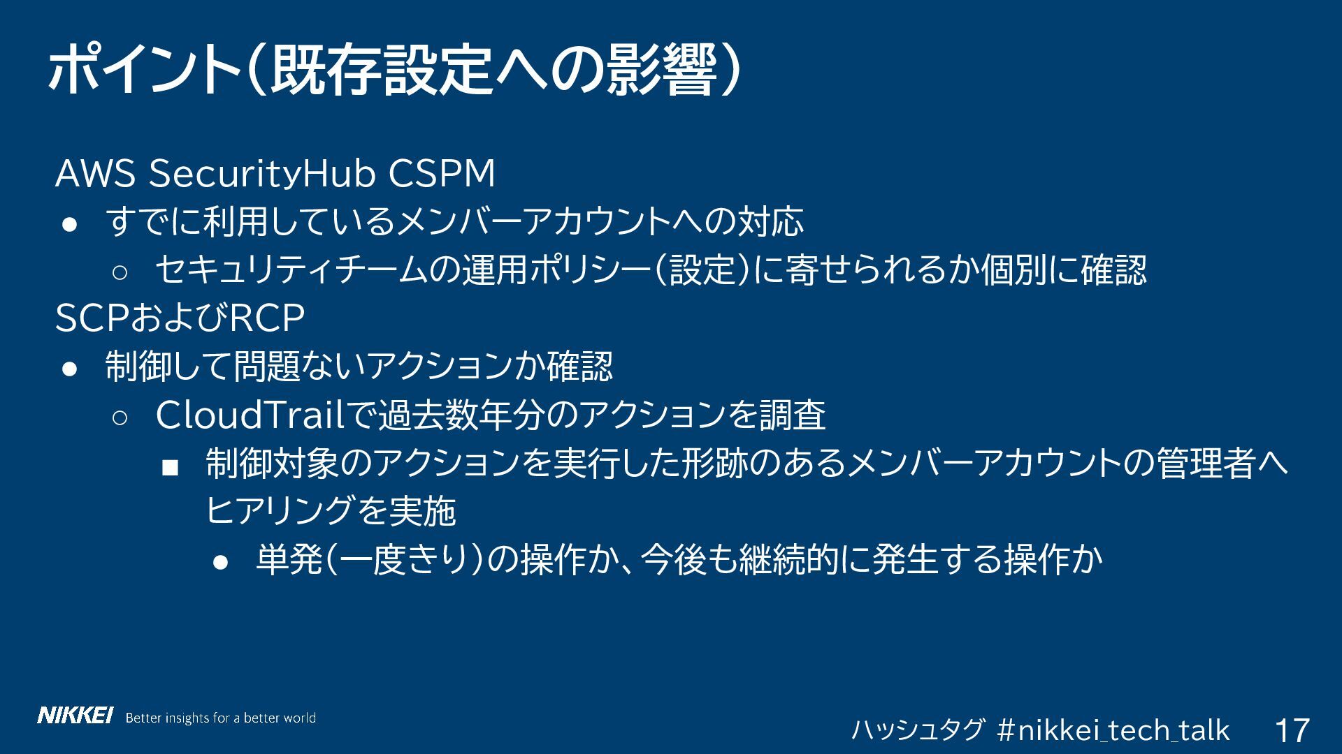 13. ハッシュタグ #nikkei_tech_talk ポイント(既存設定への影響) 16 AWS CloudTrail • 監視設定の変更 ◦ 組織証跡の保存先(S3)が既存証跡から変わるため、監視設定を変更