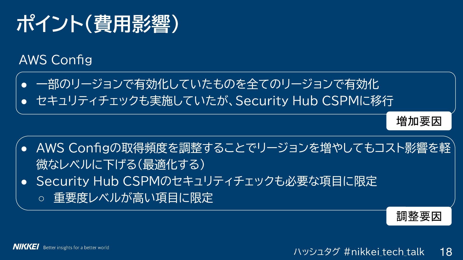 15. ハッシュタグ #nikkei_tech_talk ポイント(費用影響) 調整要因 18 AWS Config • 一部のリージョンで有効化していたものを全てのリージョンで有効化 •