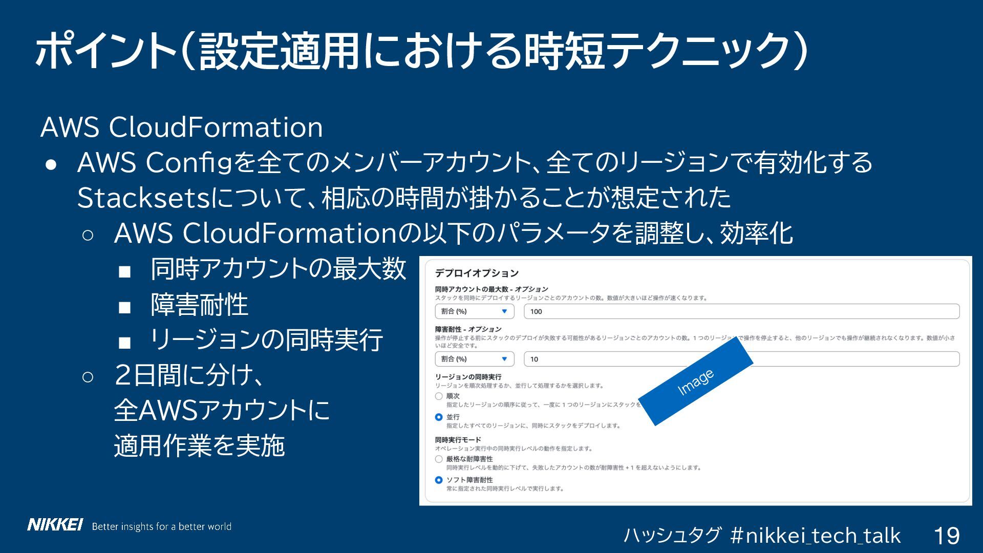 ◦ AWS CloudFormationの以下のパラメータを調整し、効率化 ▪ 同時アカウントの最大数 ▪ 障害耐性 ▪ リージョンの同時実行 ◦ 2日間に分け、 全AWSアカウントに 適用作業を実施 Image
