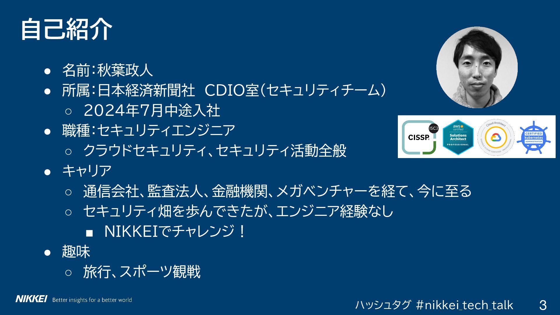 2. ハッシュタグ #nikkei_tech_talk 自己紹介 3 • 名前:秋葉政人 • 所属:日本経済新聞社 CDIO室(セキュリティチーム) ◦ 2024年7月中途入社