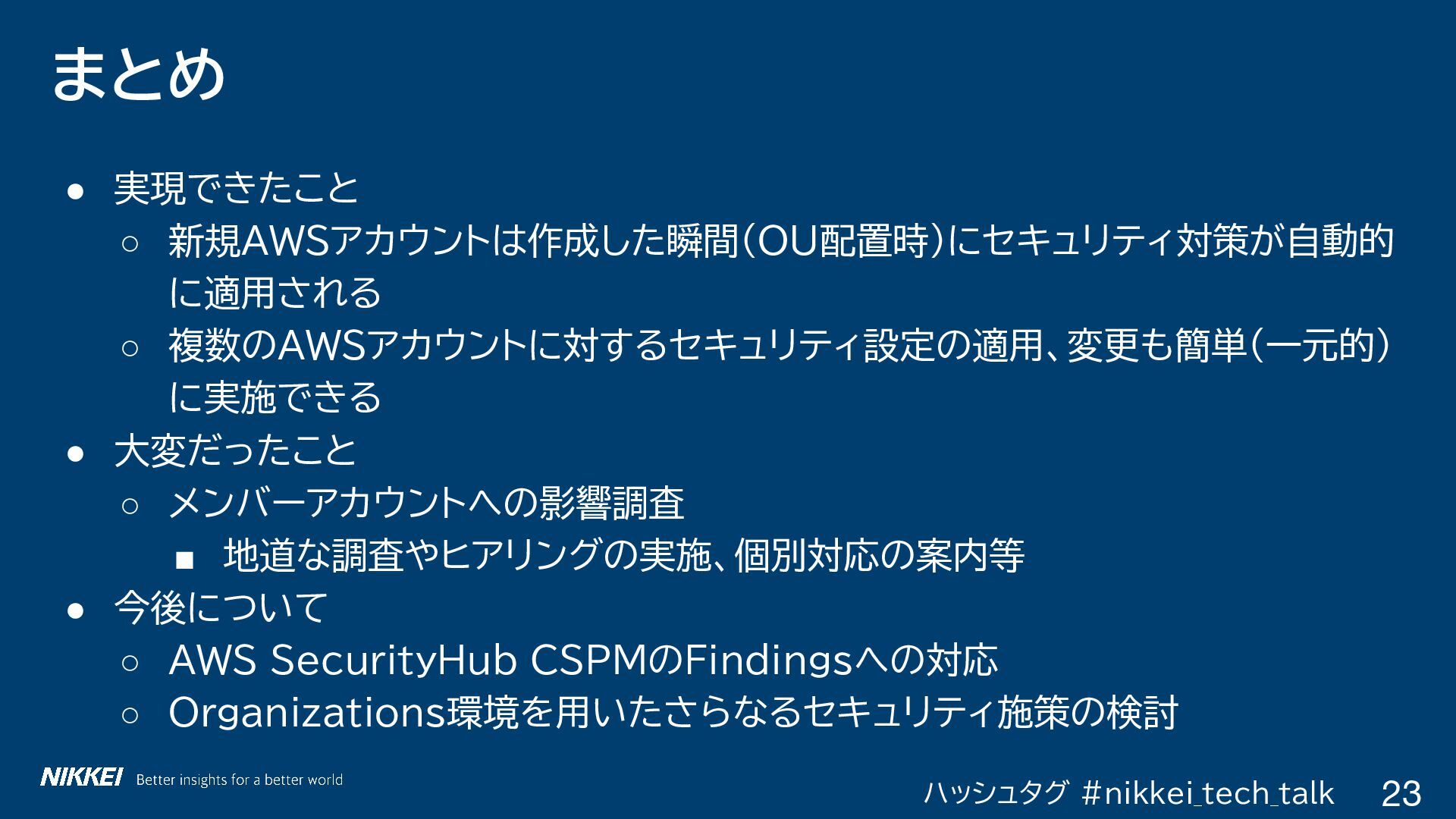 17. ハッシュタグ #nikkei_tech_talk まとめ 23 • 実現できたこと ◦ 新規AWSアカウントは作成した瞬間(OU配置時)にセキュリティ対策が自動的 に適用される ◦
