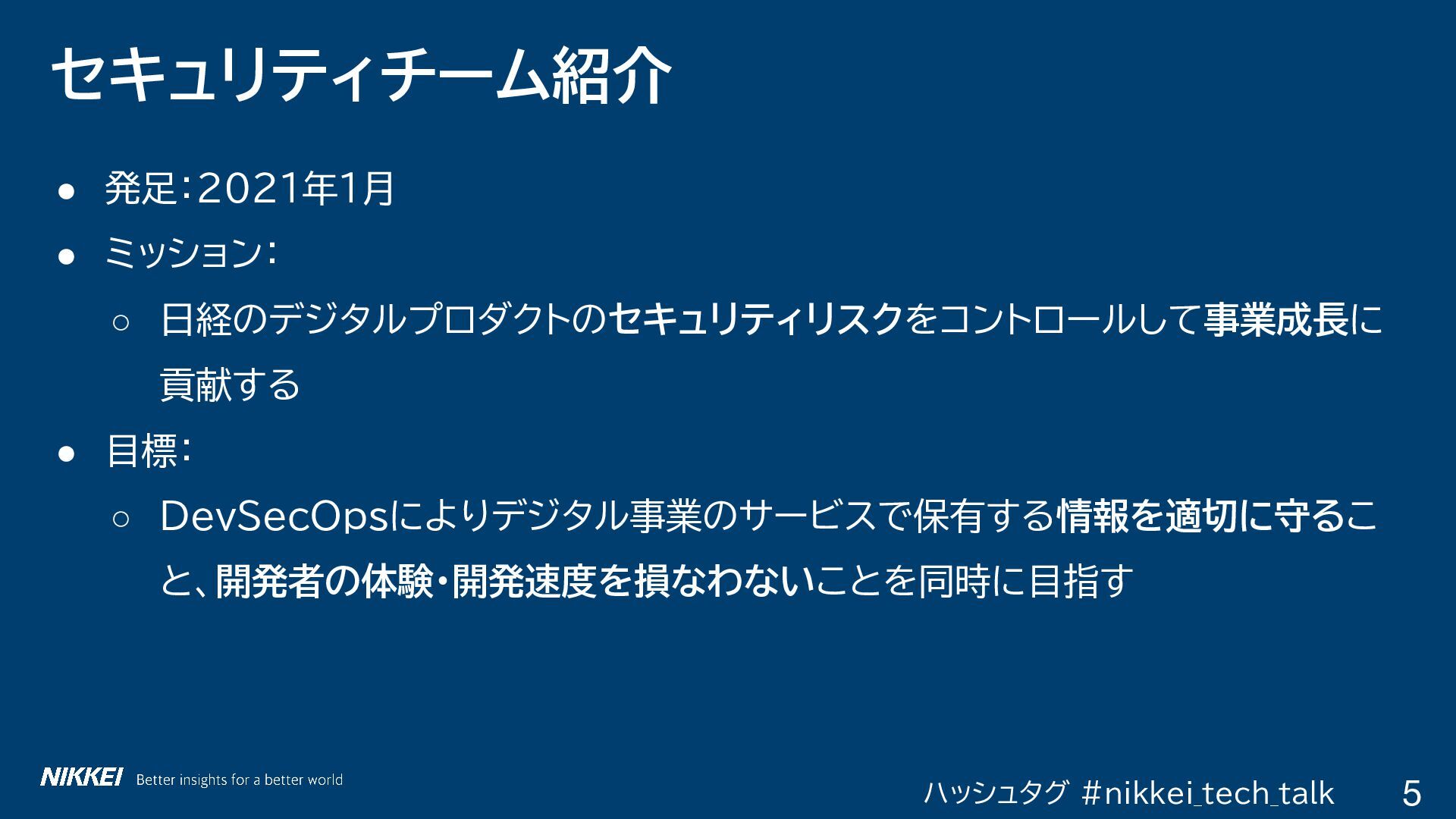 4. ハッシュタグ #nikkei_tech_talk セキュリティチーム紹介 • 発足:2021年1月 • ミッション: ◦ 日経のデジタルプロダクトのセキュリティリスクをコントロールして事業成長に 貢献する
