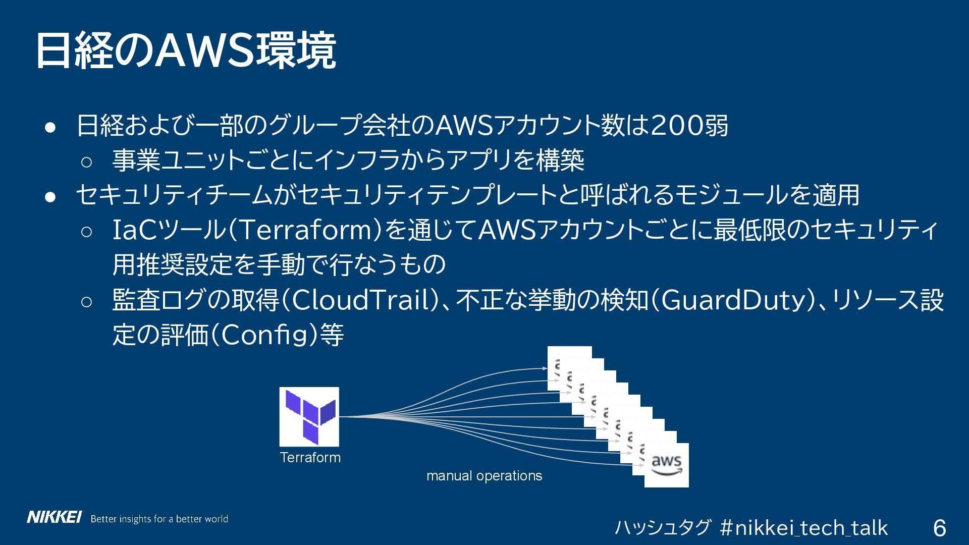 5. ハッシュタグ #nikkei_tech_talk 日経のAWS環境 6 • 日経および一部のグループ会社のAWSアカウント数は200弱 ◦ 事業ユニットごとにインフラからアプリを構築 • セキュリティチームがセキュリティテンプレートと呼ばれるモジュールを適用