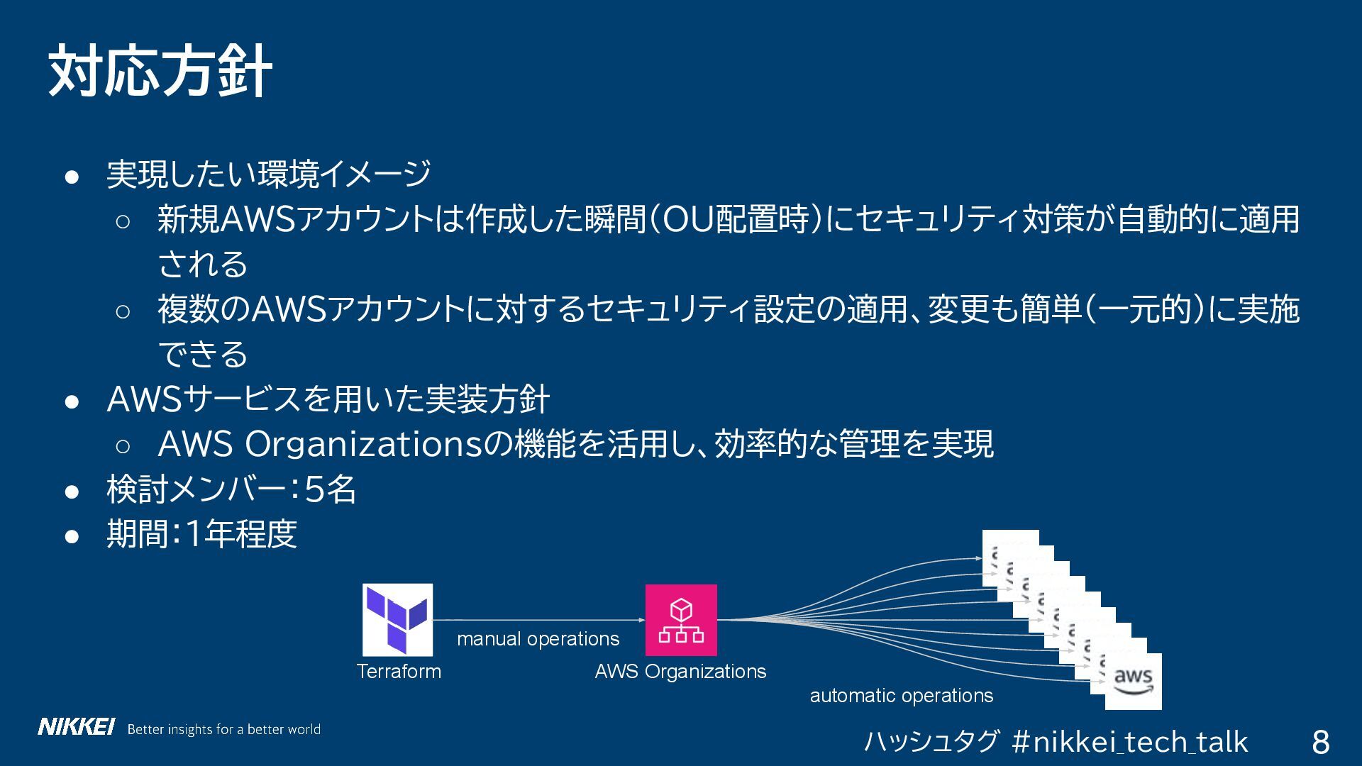 7. ハッシュタグ #nikkei_tech_talk 対応方針 8 • 実現したい環境イメージ ◦ 新規AWSアカウントは作成した瞬間(OU配置時)にセキュリティ対策が自動的に適用 される ◦