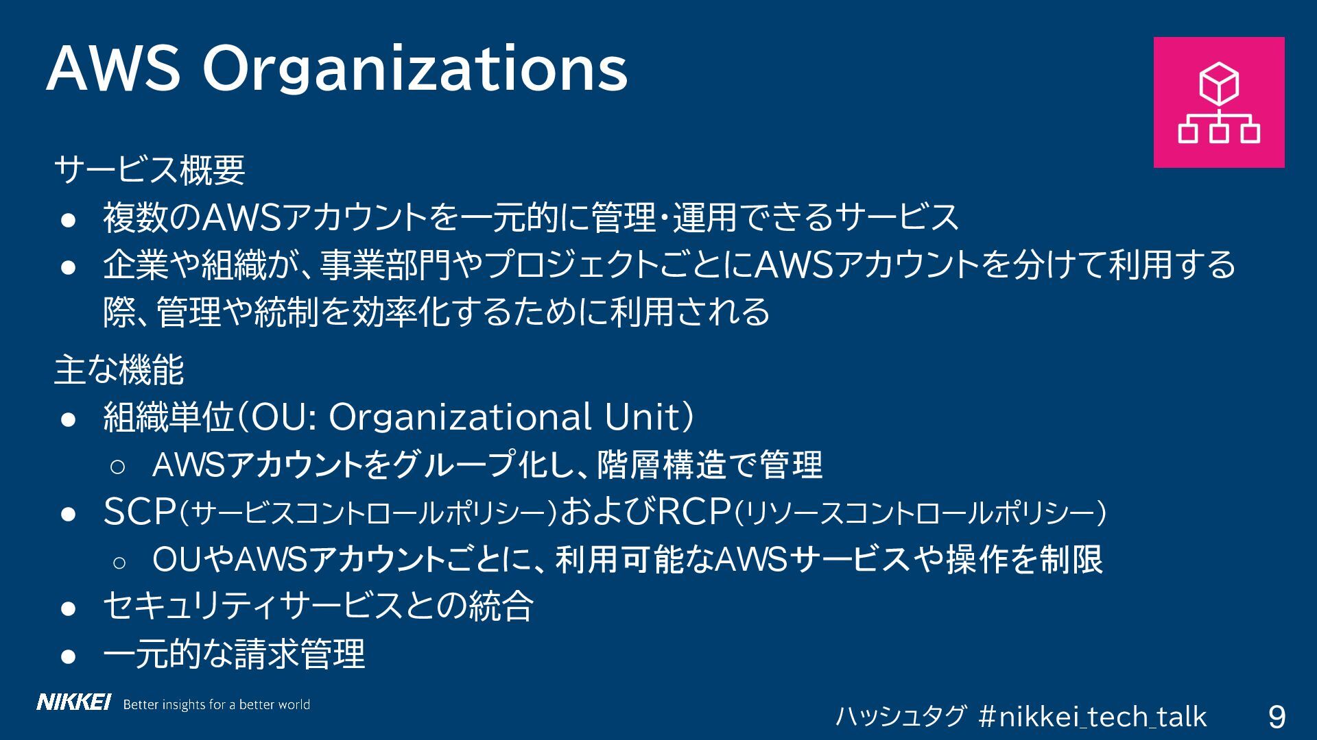 8. ハッシュタグ #nikkei_tech_talk AWS Organizations 9 サービス概要 • 複数のAWSアカウントを一元的に管理・運用できるサービス • 企業や組織が、事業部門やプロジェクトごとにAWSアカウントを分けて利用する
