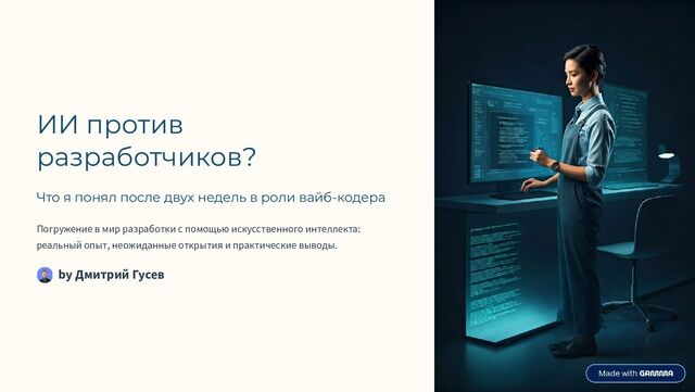 ИИ против разработчиков — презентация о том, как инструменты на базе LLM меняют процессы разработки. Разбор современных решений (ChatGPT, Cursor, AutoCode, no-code/low-code платформы), эффектов ускорения MVP/PoC, рисков деградации инженерного уровня, а также прогнозов по вытеснению части задач из фронта разработки в сторону AI-инструментов.