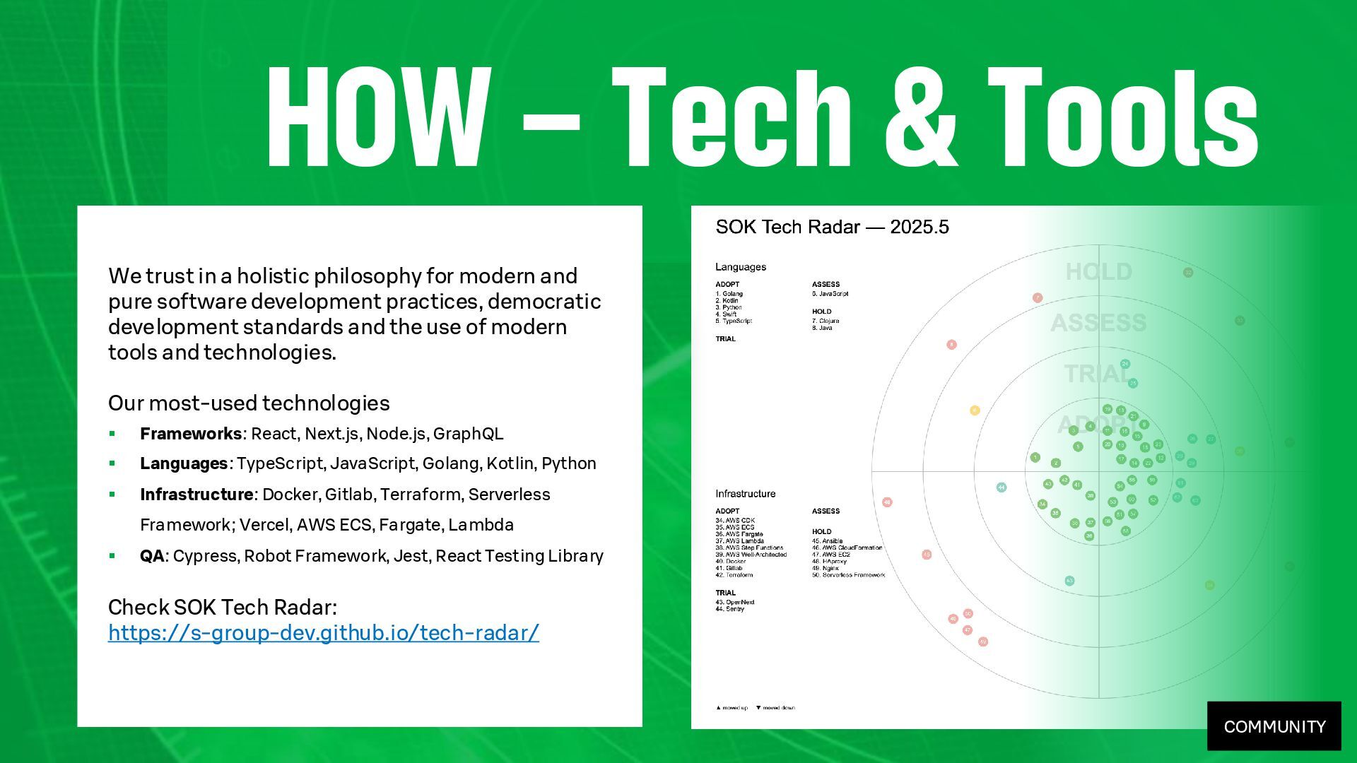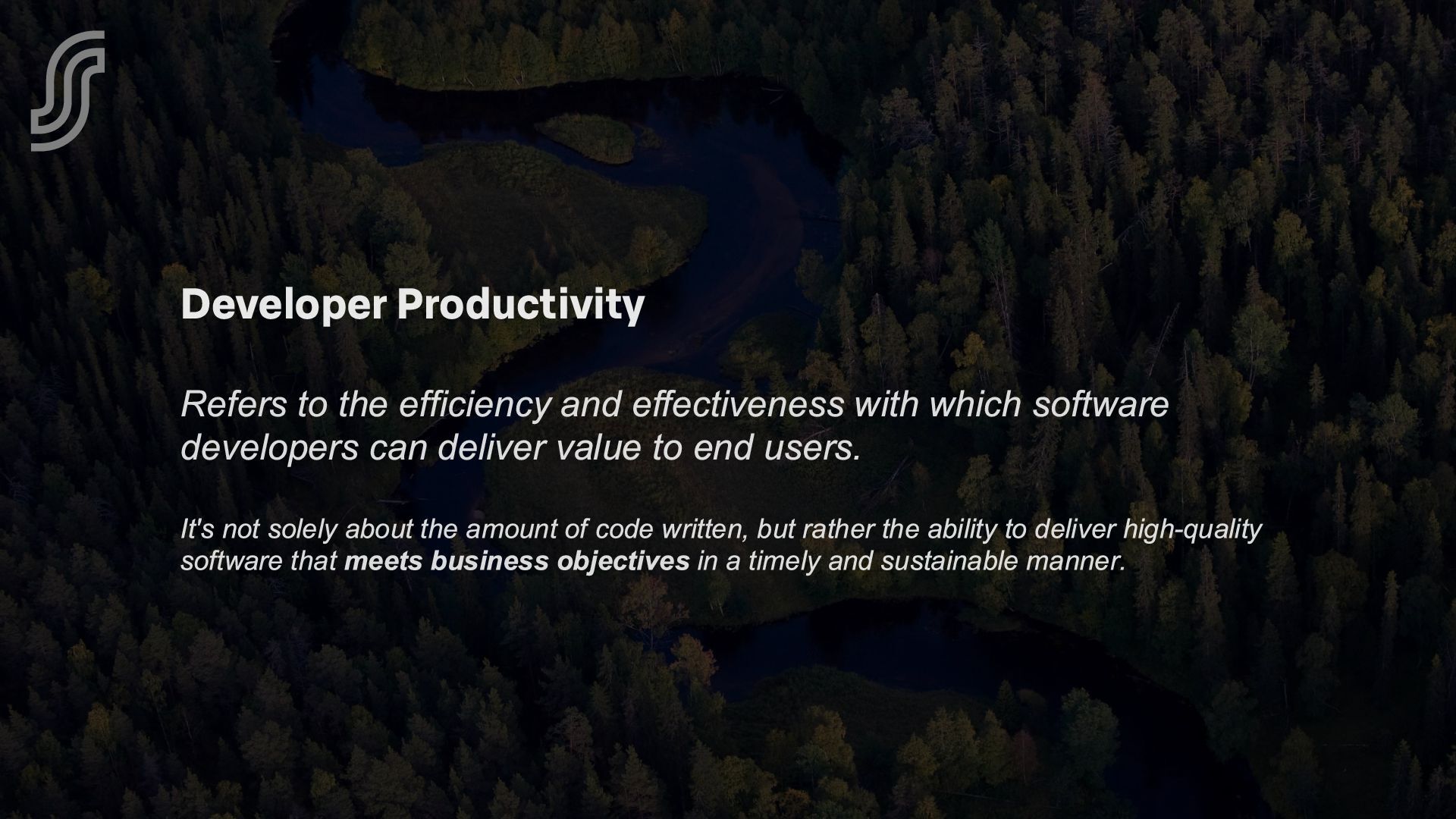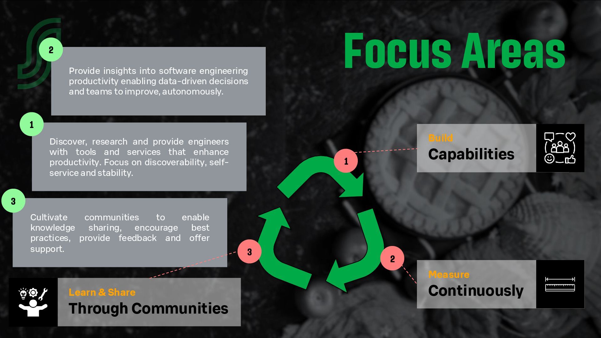 - Our approach to productivity: measuring (using research and data), capabilities (through tooling) and community (for awareness and sharing).